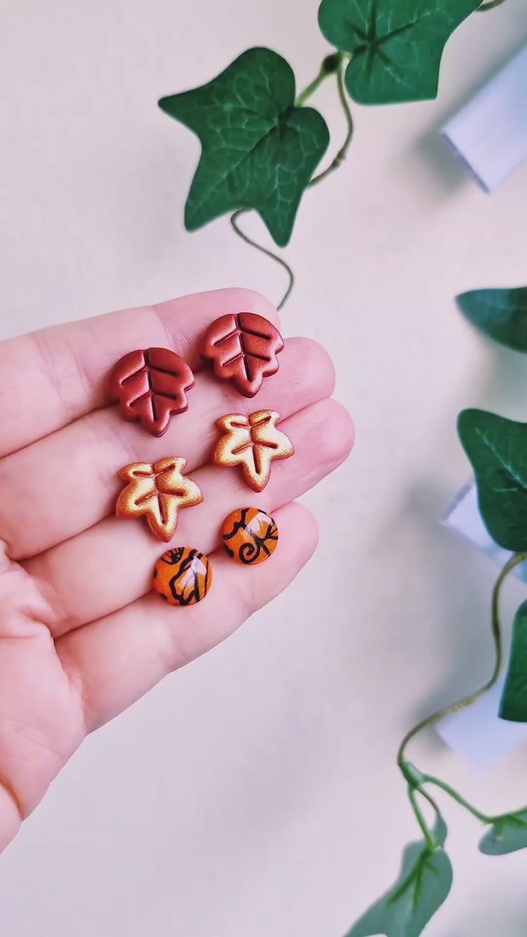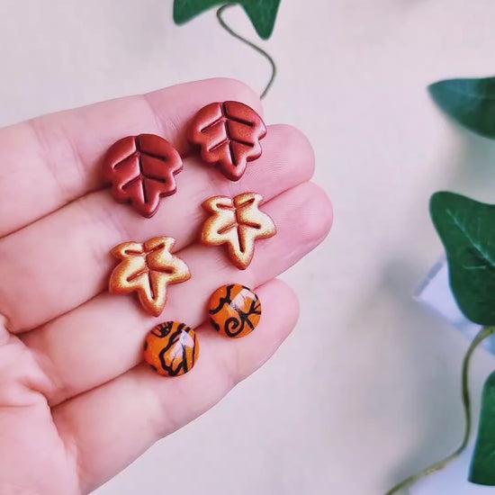 3 par studs av polymerlera och resin. Ett par burgundy höstlöv med ett matalliskt skimmer, ett par pumpaorangea höstlöv med ett magiskt glittrande metalliskt skimmer samt ett par runda pumpaorangea mindre studs med ett svart blommönster. Stift av rostfritt stål, nickelsäkra.