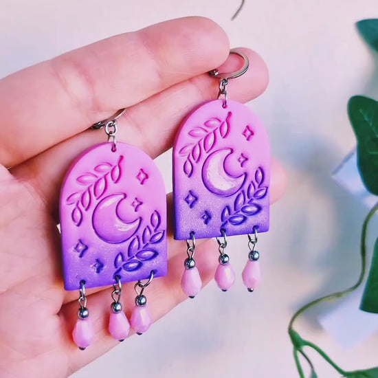 Rosa/lila fadeade örhängen av polymerlera med ingraverat mönster av månar och kvistar/blad. I den lila leran finns ett vackert skimmer som träder fram i olika ljus. Mönstret är lackat med högglans vilket ger en fin kontrast till den matta bakgrunden. Rosa glasdroppar samt små runda pärlor av silverfärgad hematit. Brisyrer (låskrokar), hattpinnar och bindringar av rostfritt stål, nickelsäkra. Finns endast 2 exemplar!