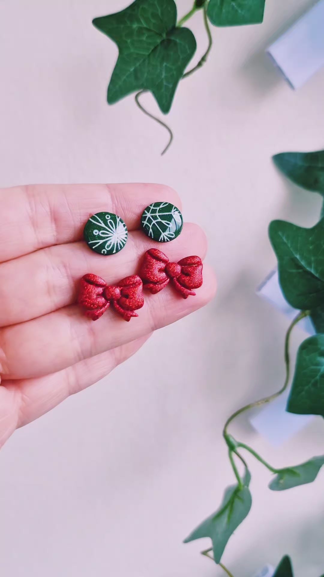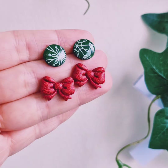 Två par studs av polymerlera och resin - ett par glittriga röda små rosetter samt ett par gröna runda med vitt snöflingsmönster. Stift av rostfritt stål, nickelsäkra.