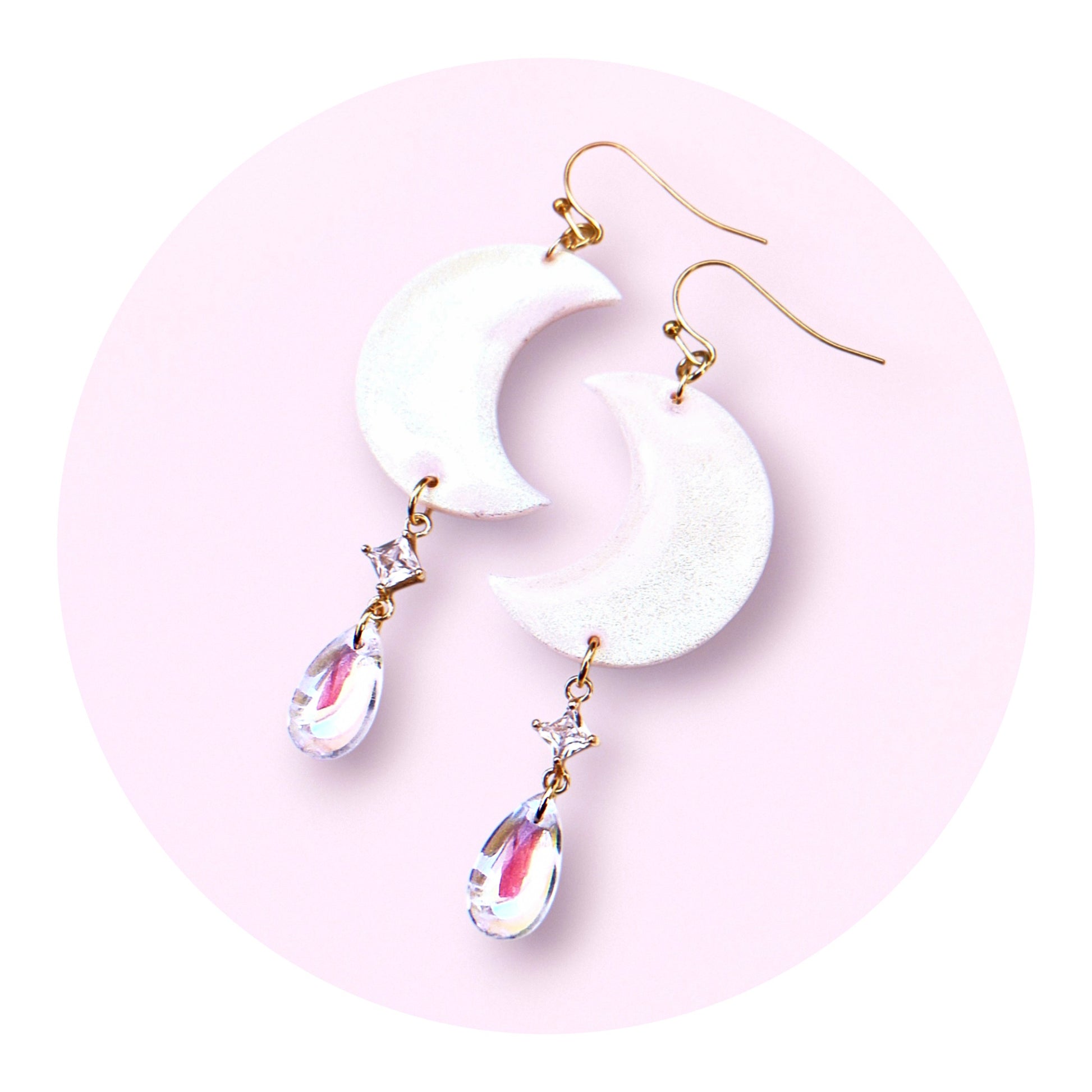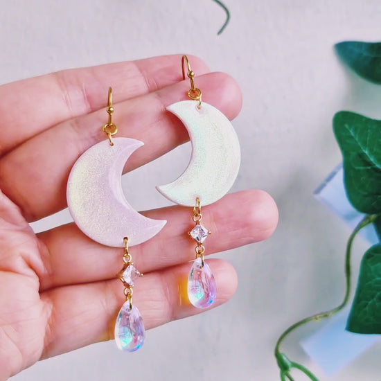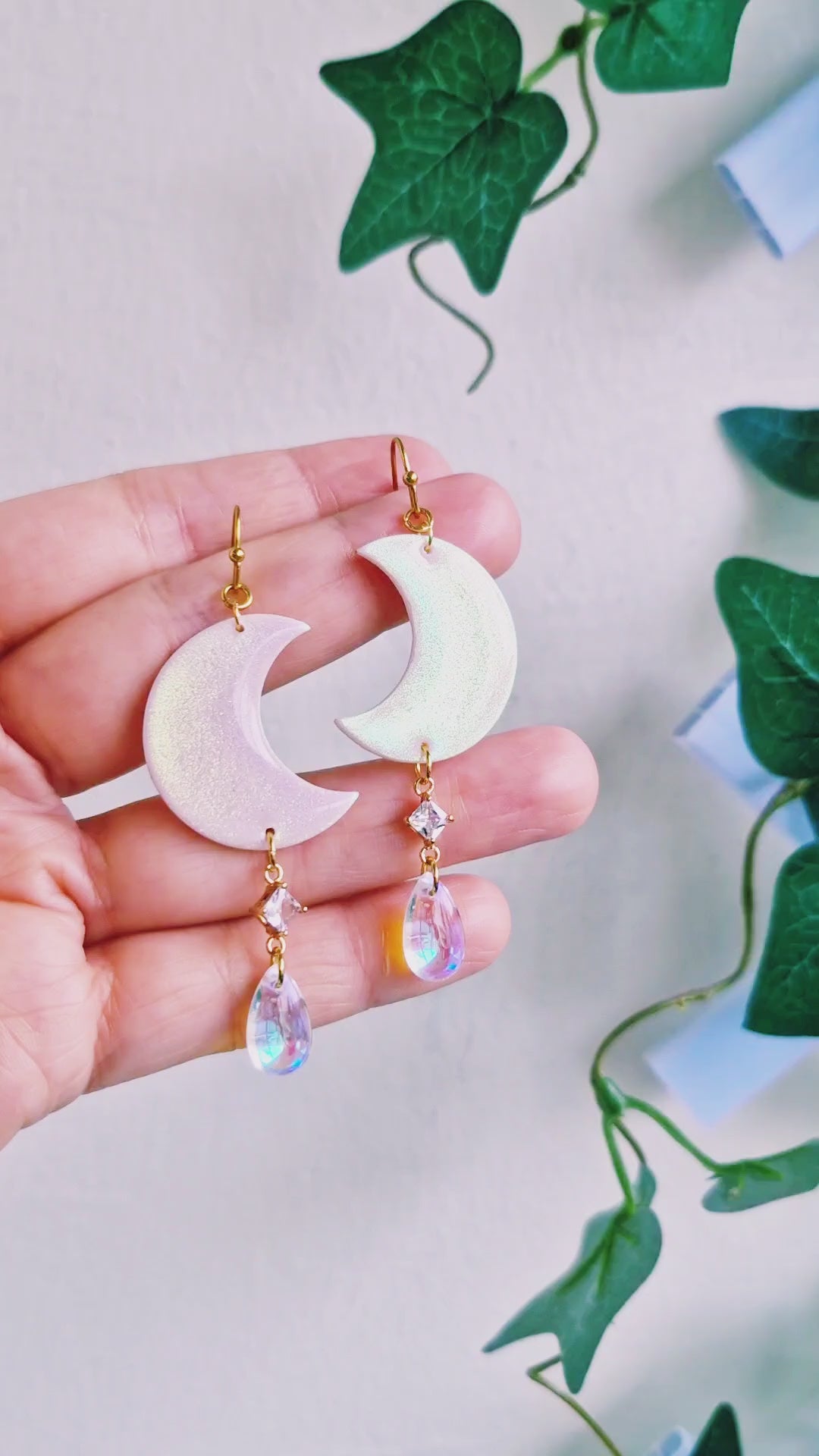Vita magiskt vackra Enchanting Moons av polymerlera och resin med opalglitter inuti som skimrar otroligt vackert i olika ljus och vinklar. Genomskinliga kristallstenar samt glasdroppar med opaleffekt längst ner. Örkrokar och bindringar av guldpläterat rostfritt stål, nickelsäkra.