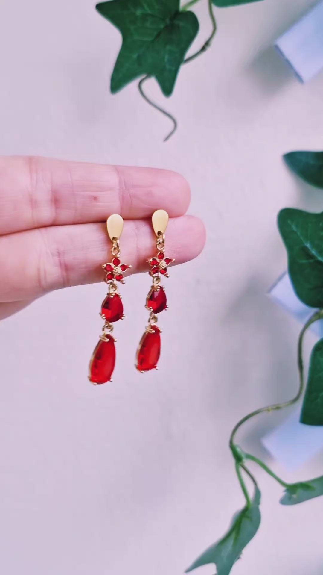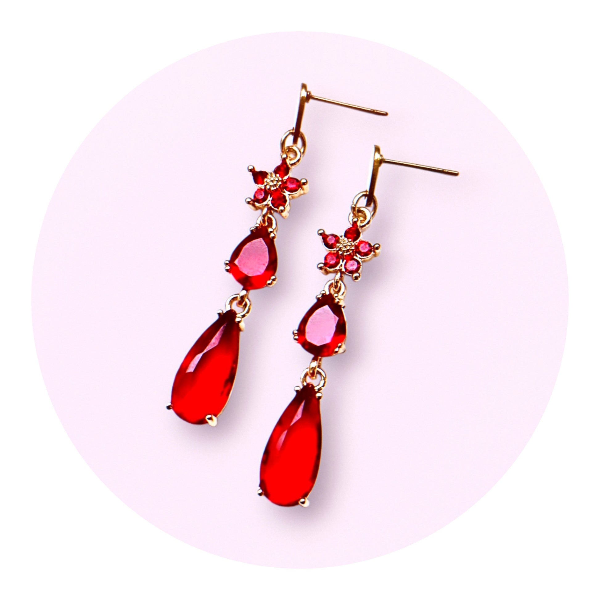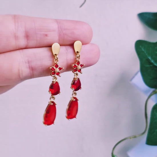 Vackra örhängen med röda glaskristaller samt röda kristallblommor. Droppstift och bindringar av gulpläterat rostfritt stål, nickelsäkra. Det finns endast 1 unikt par!