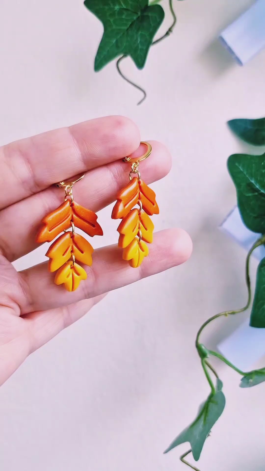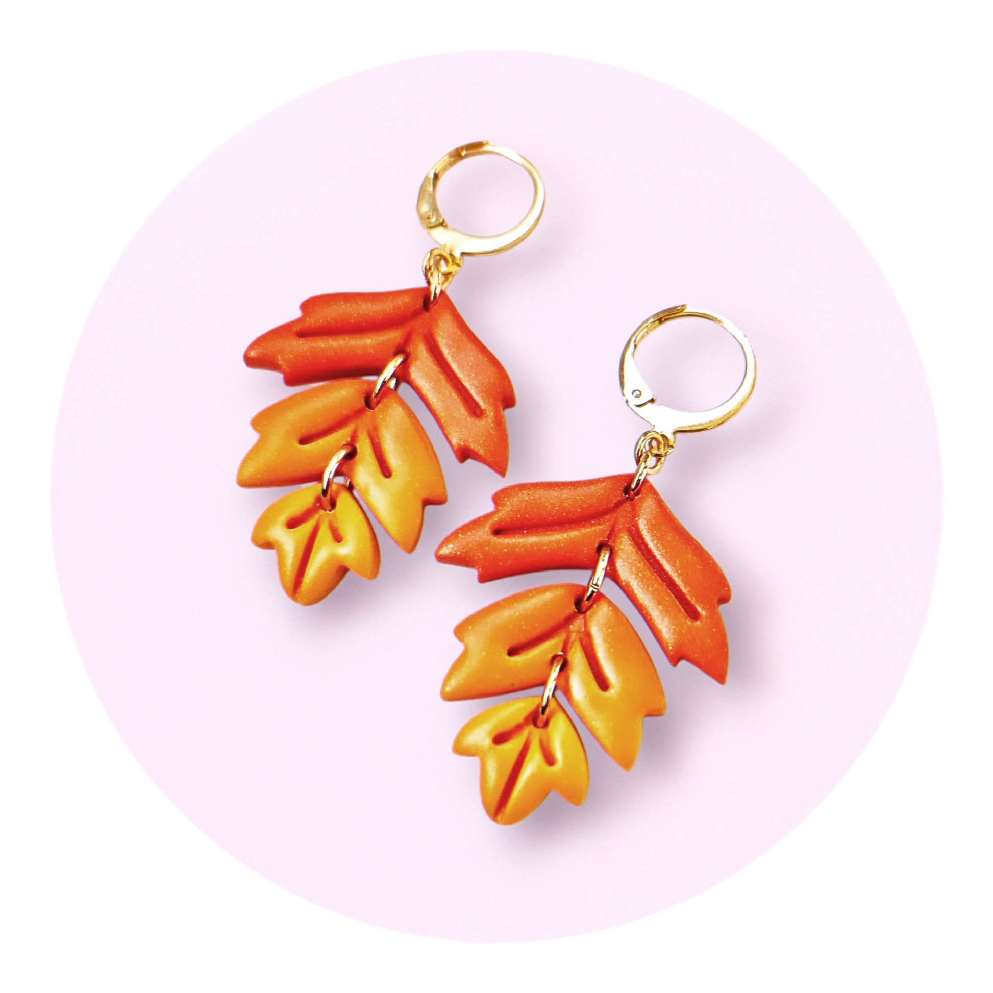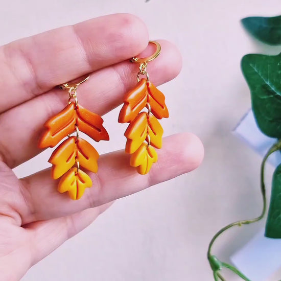 Höstlöv i 3 delar av polymerlera fadeade från oranget till gult med ett subtilt skimmer. Brisyrer (låskrokar) och bindringar av guldpläterat rostfritt stål, nickelsäkra.