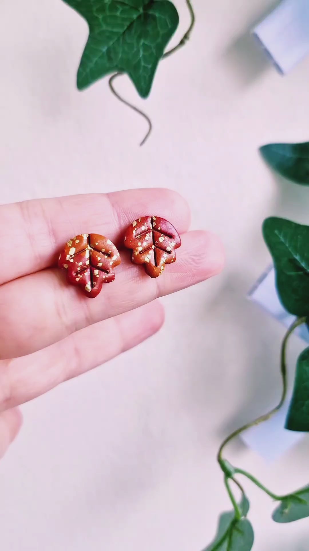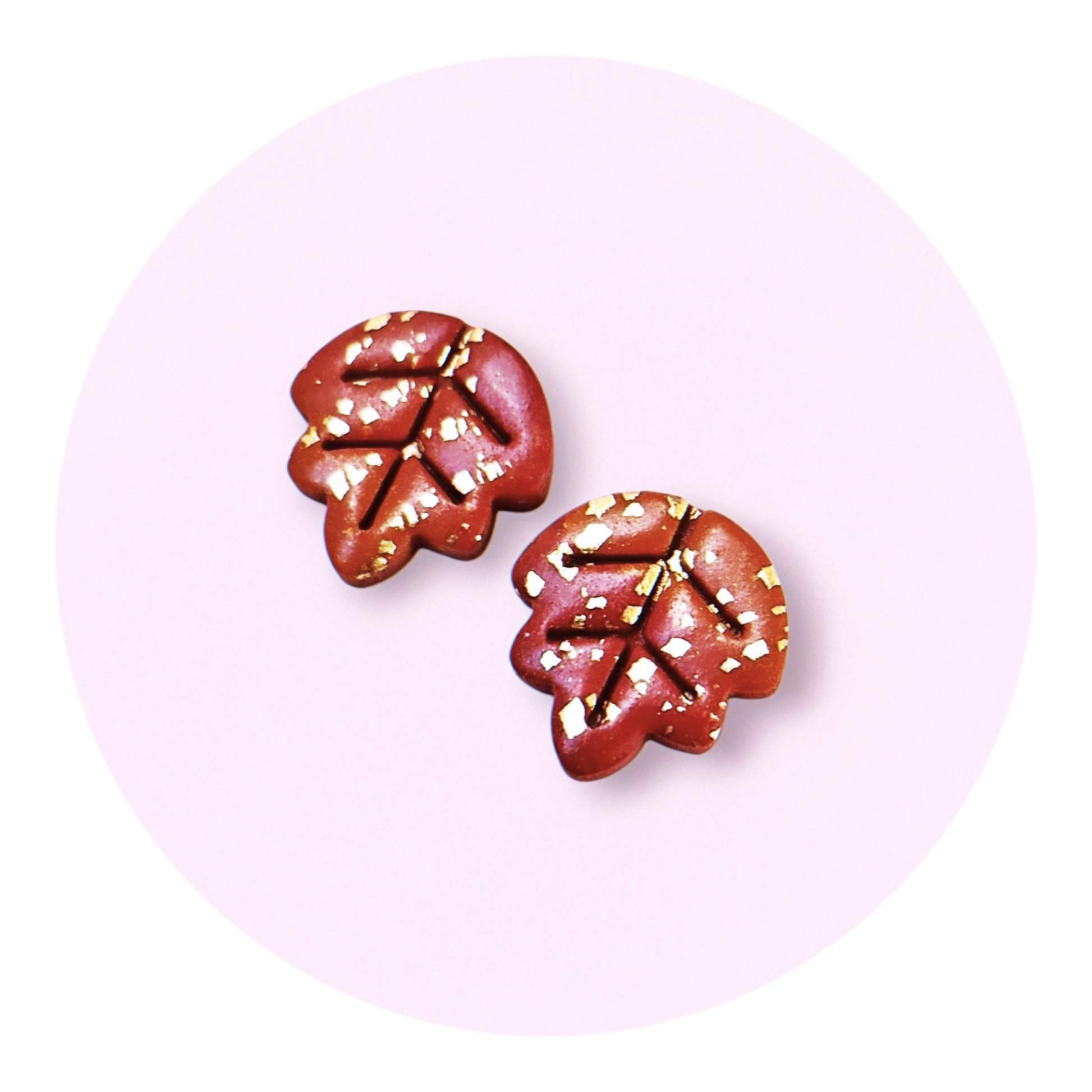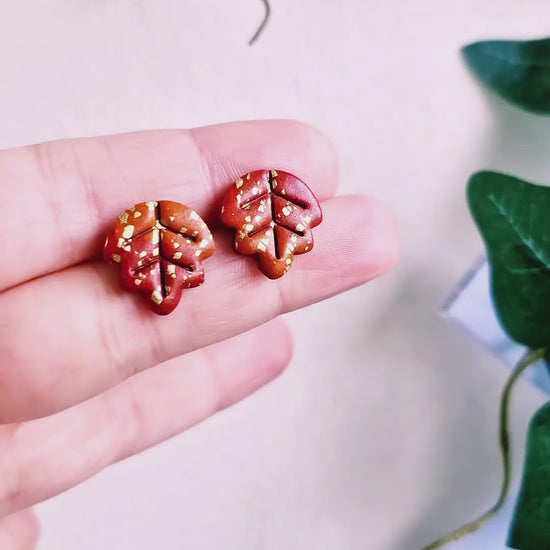 1 par höstlövs-studs av polymerlera med guldiga detaljer av bladguld. Stift av rostfritt stål, nickelsäkra.