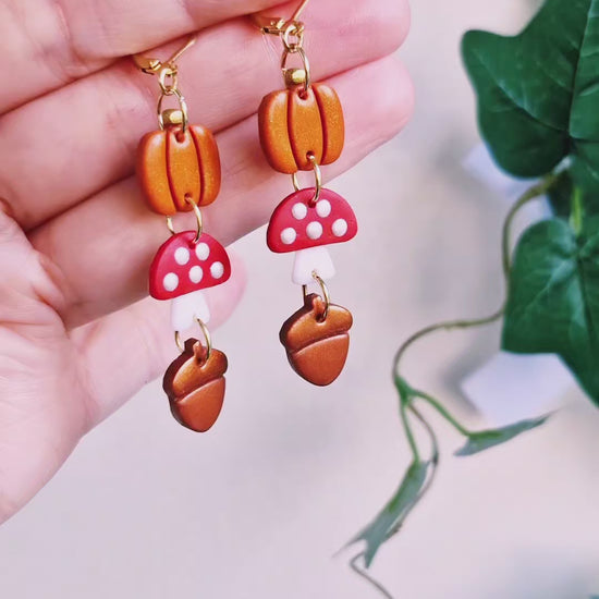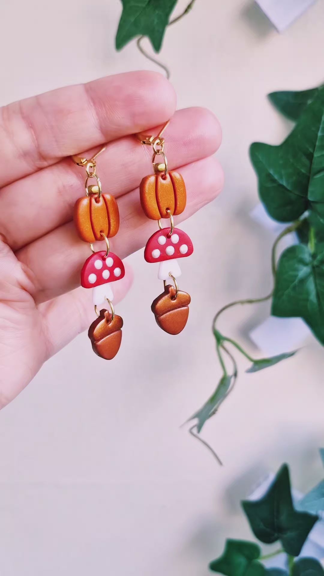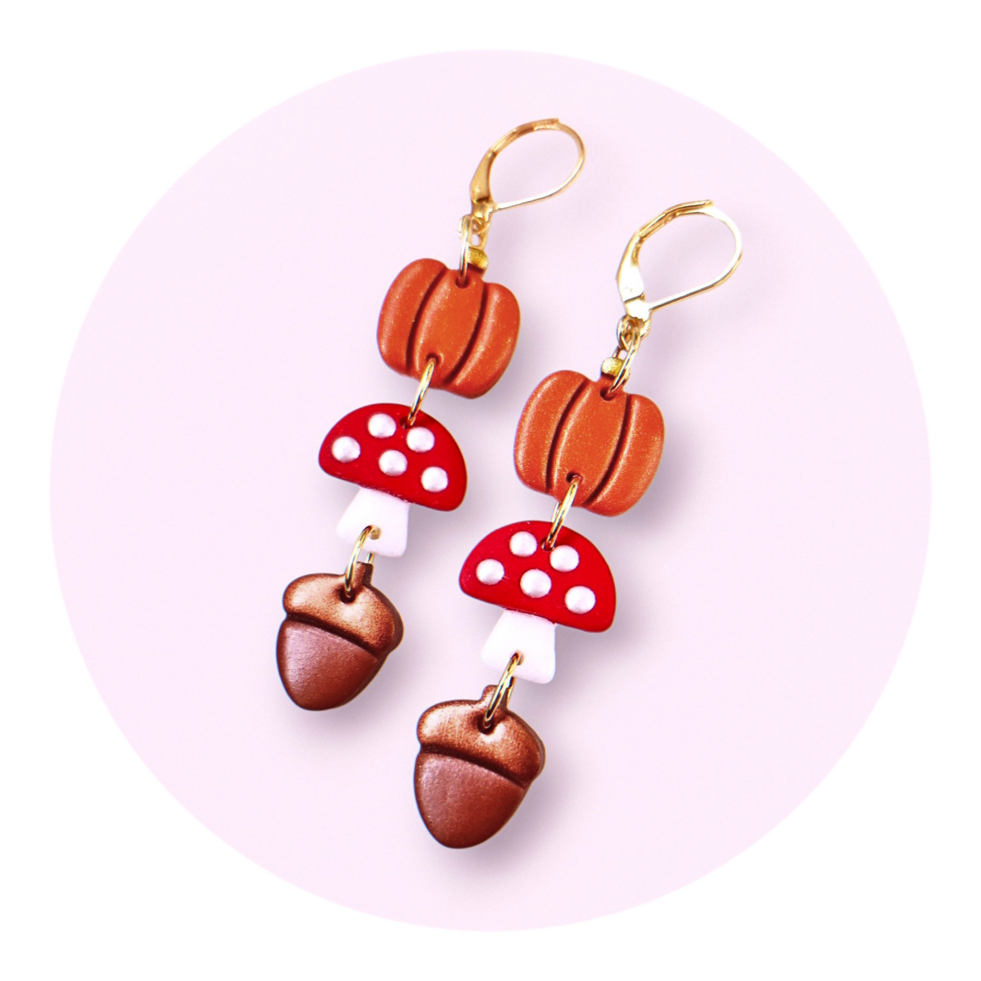3 i rad örhängen med pumpor, flugsvampar samt ekollon gjorda av polymerlera. Skimmer samt vackra pärldetaljet på de olika delarna. Brisyrer (låskrokar) samt bindringar av guldpläterat rostfritt stål, nickelsäkra.