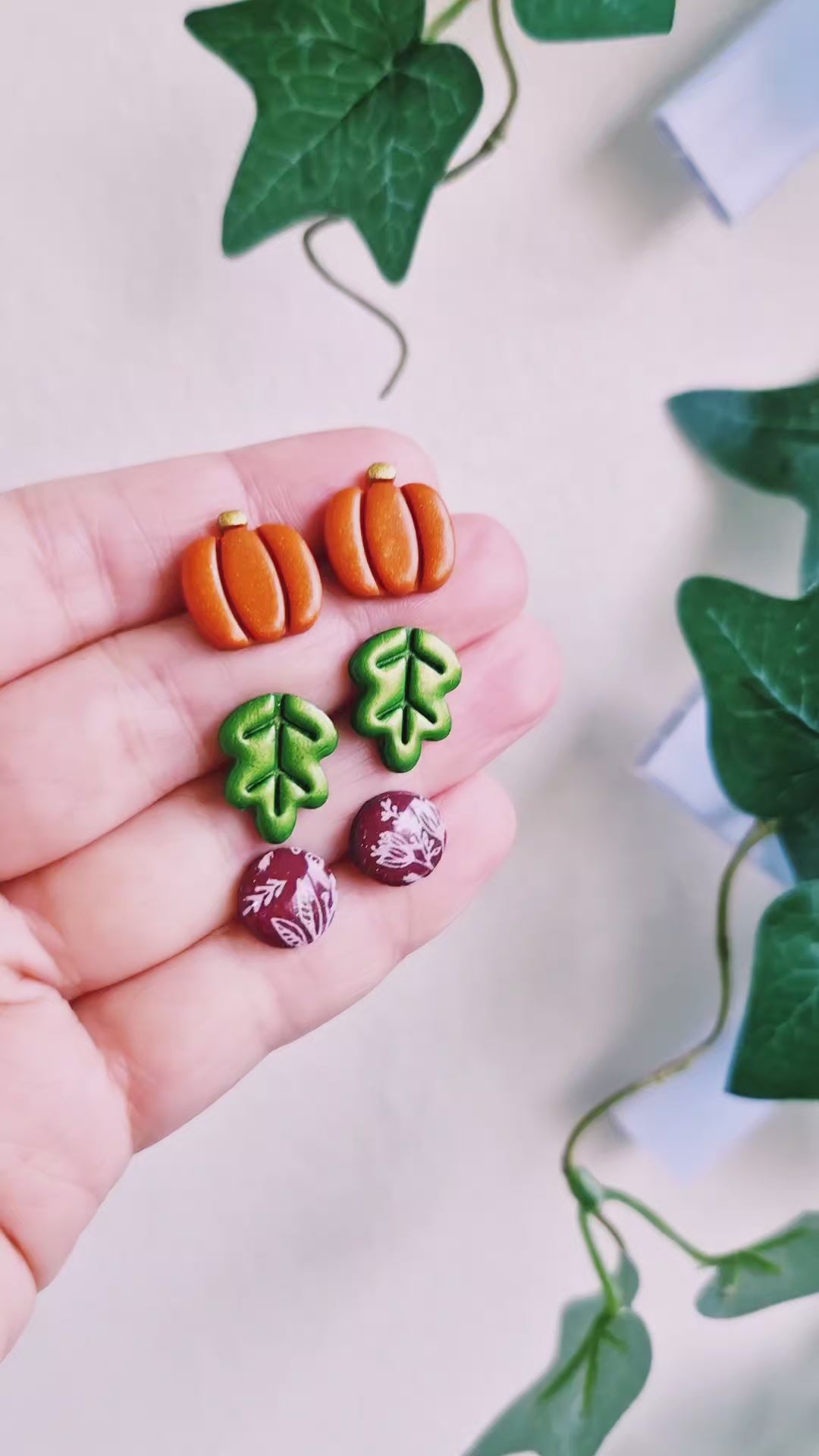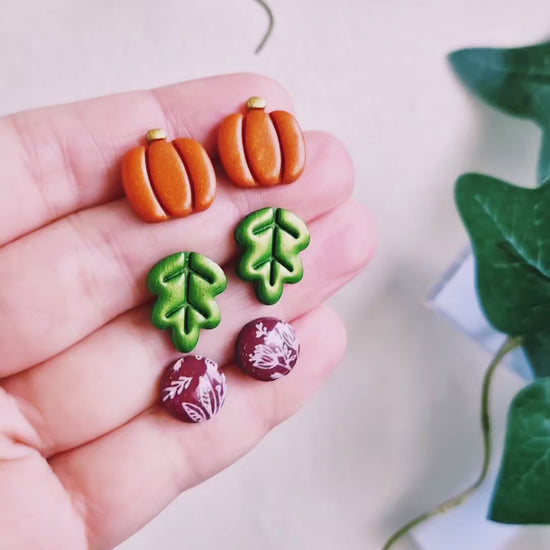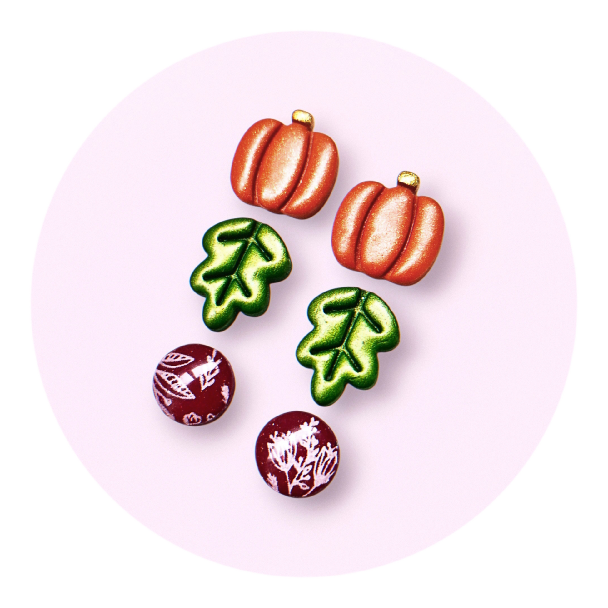 3 par studs av polymerlera och resin. Ett par skimriga pumpor med gulddetaljer, ett par gröna löv med ett metalliskt skimmer samt ett par runda burgundy mindre studs med ett ljusrosa blommönster. Stift av rostfritt stål, nickelsäkra.