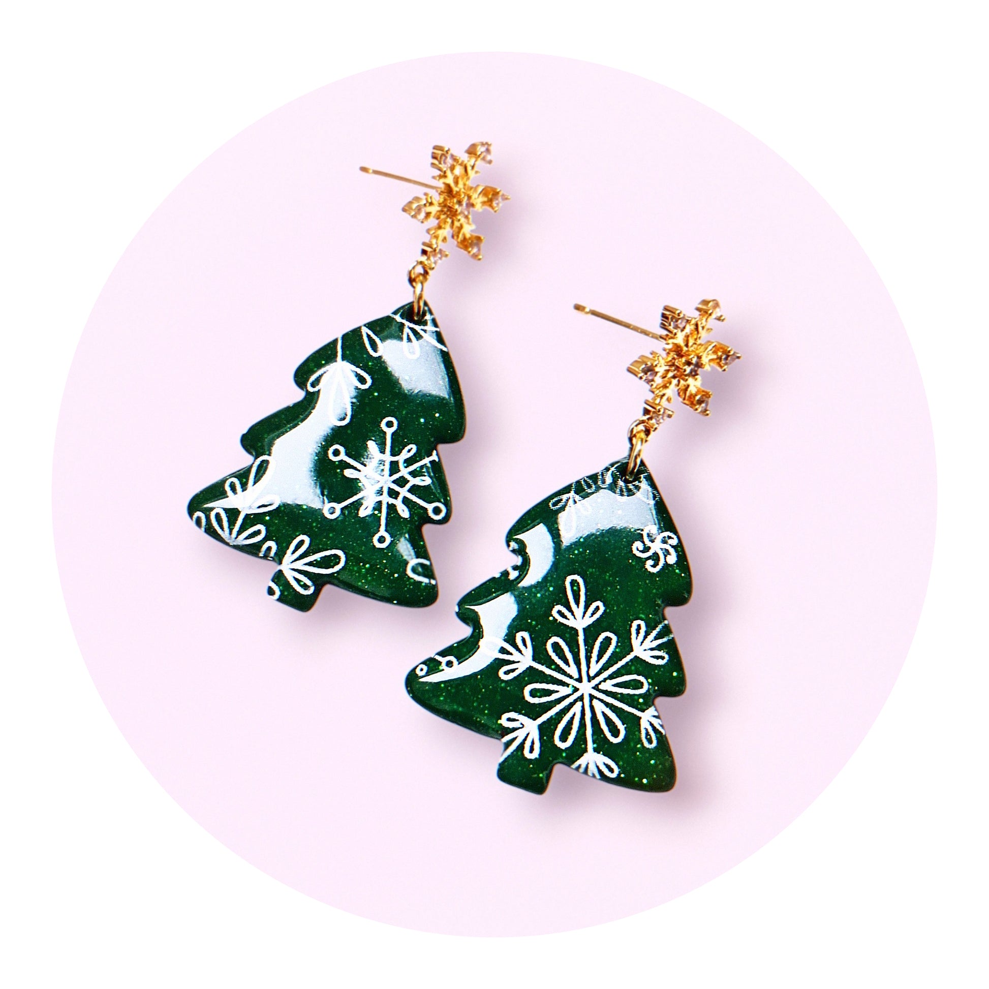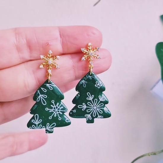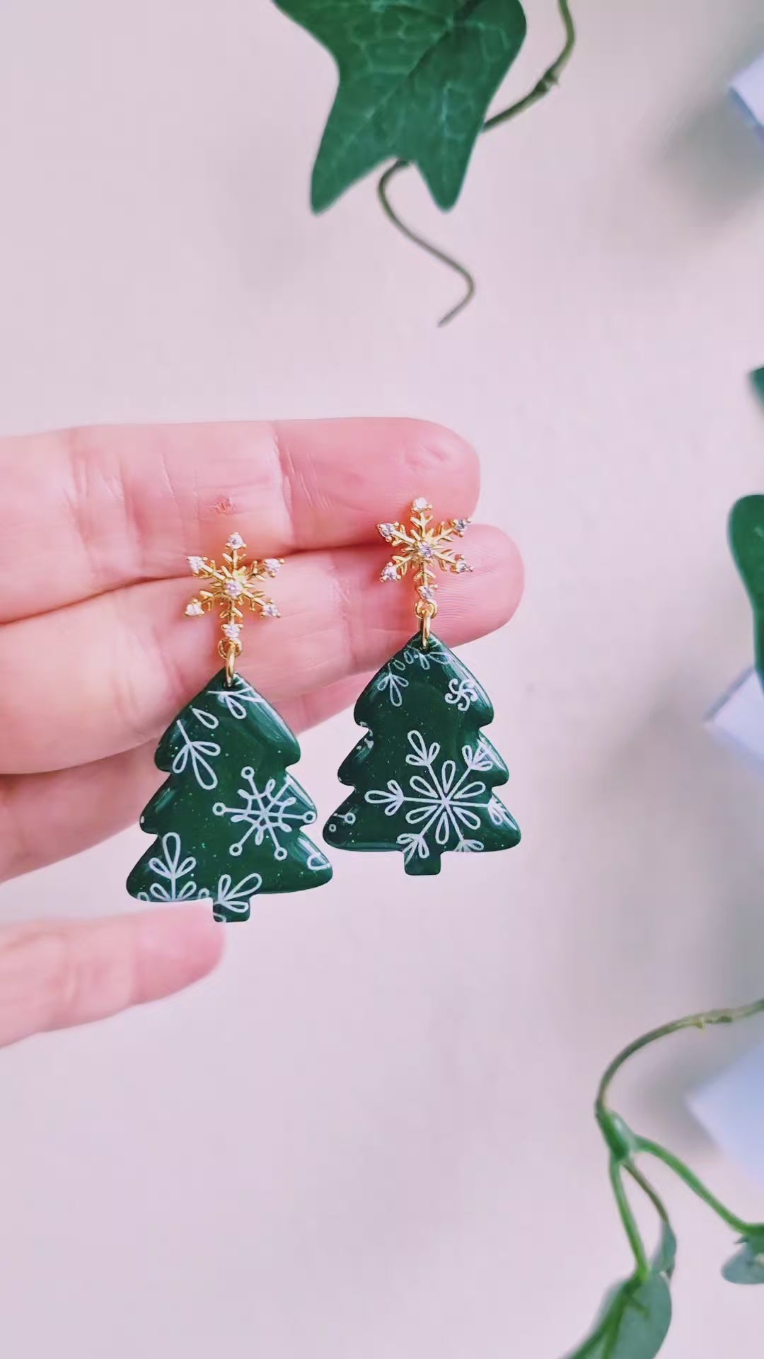 Gröna julgranar av polymerlera och resin med glitter i, målade med ett fint snöflingsmönster. Stift i form av snöflingor som är 18k guldpläterade samt har små Cubic zirconia kristaller, nickelsäkra. Det finns endast 2 unika par, snöflingsmönstret varierar på dem.