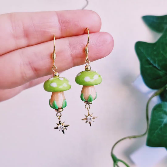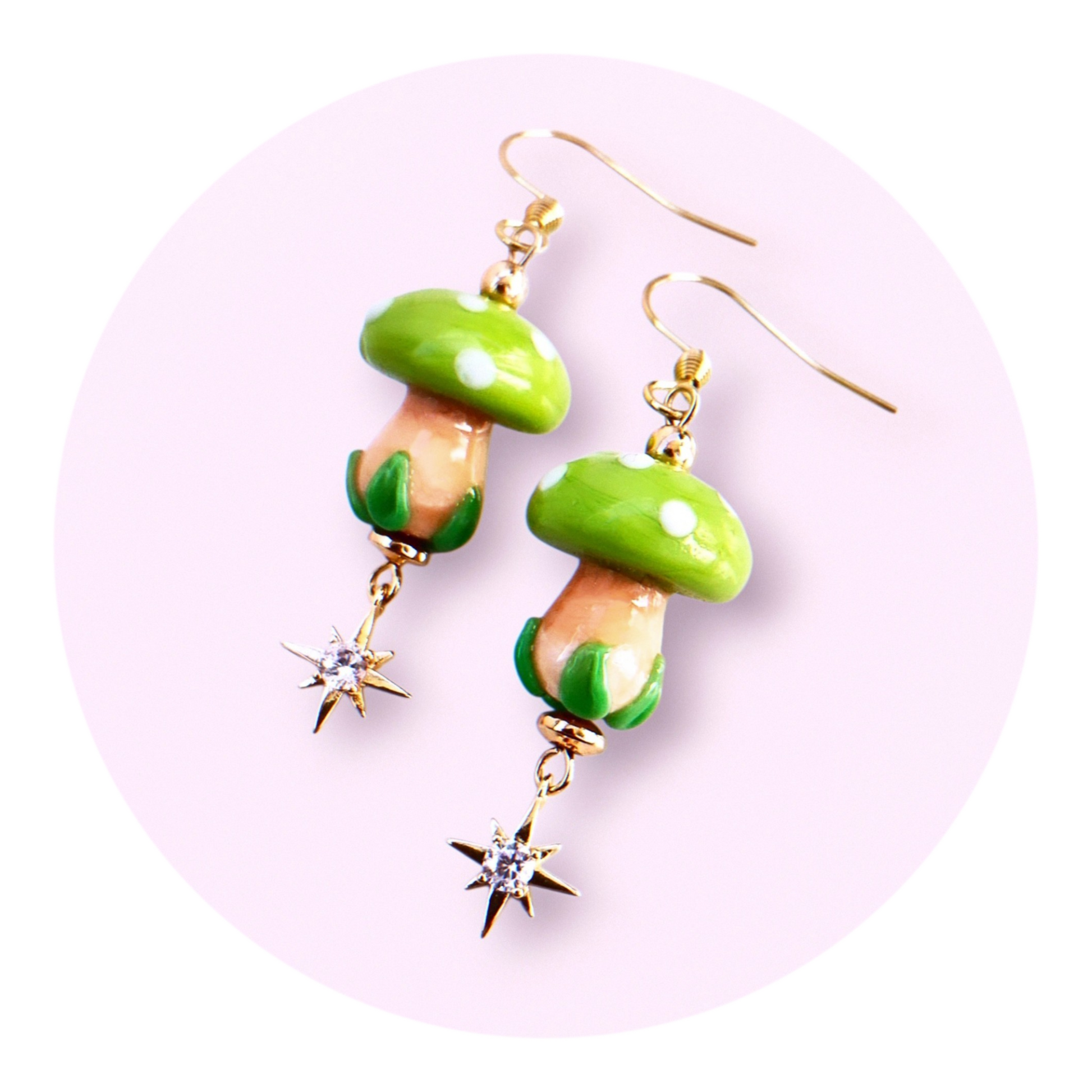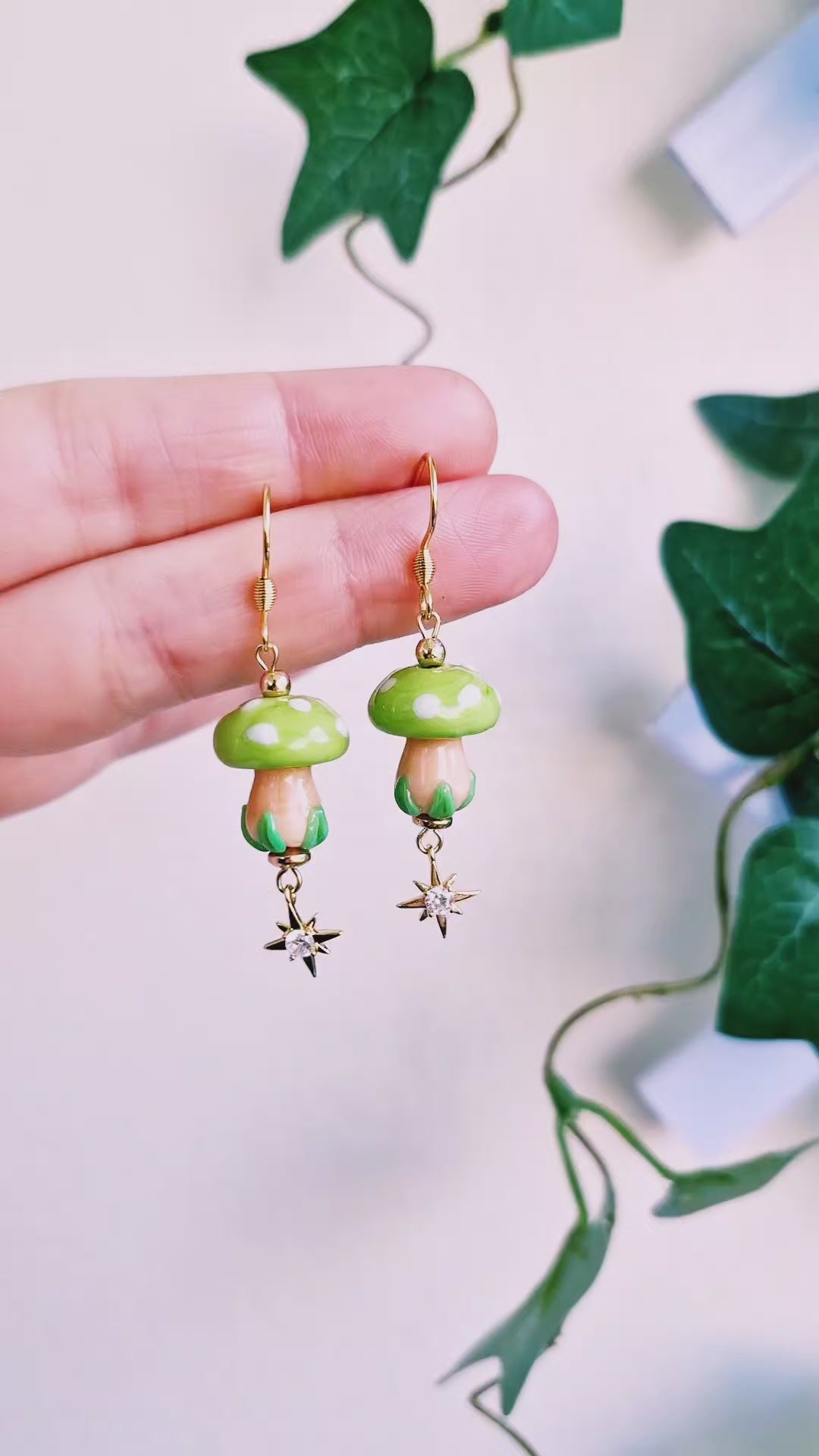 Ljusgröna flugsvampar av glas med guldiga dinglande stjärnor med små kristallstenar undertill. Pärlor av guldfärgad hematit. Örkrokar och öglepinnar av guldpläterat rostfritt stål, nickelsäkra.