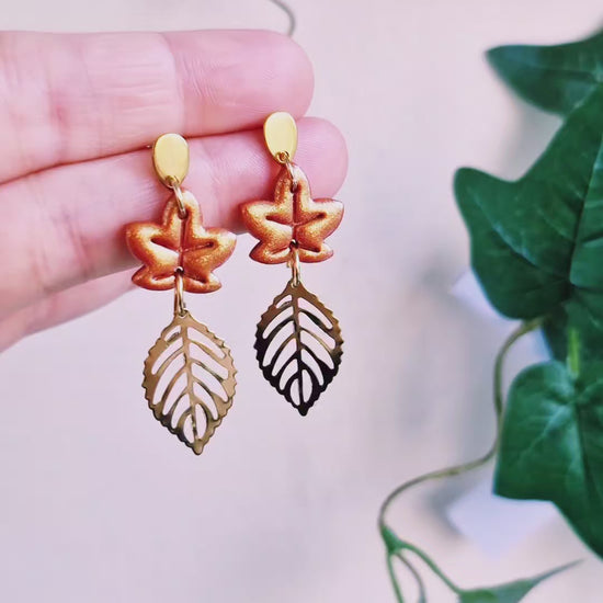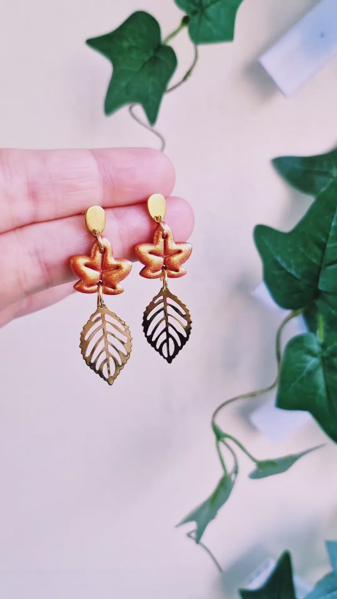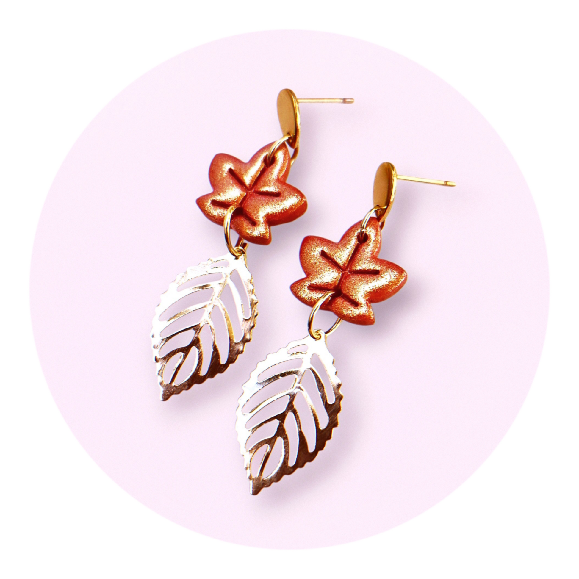 Pumpaorangea höstlöv gjorda av polymerlera med ett magiskt glittrande metalliskt skimmer. Löv undertill i guldpläterat rostfritt stål. Stift av guldpläterat rostfritt stål, nickelsäkra.