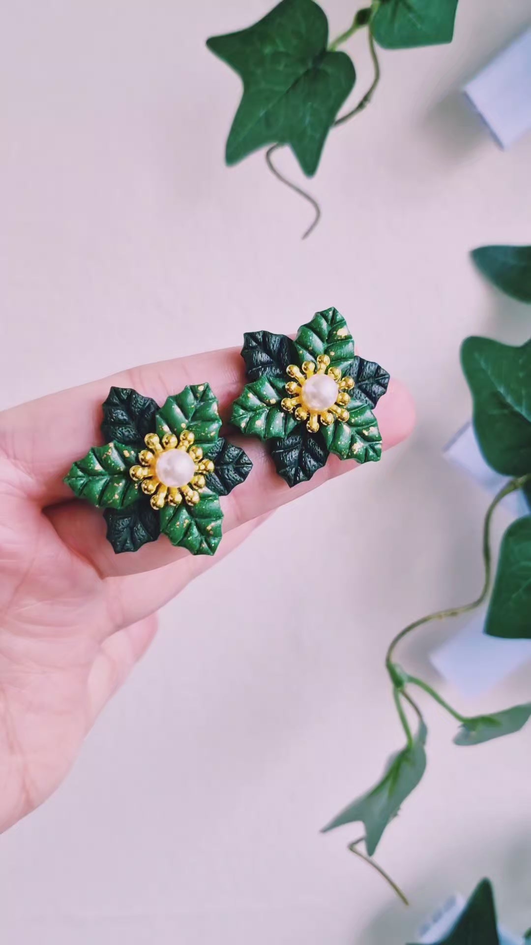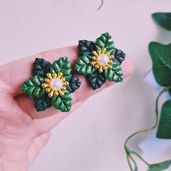 Studs-örhängen föreställande järnek i en helt egen design. Gjorda av polymerlera med textur samt bladguldsstänk. Mitten pryds av en vacker vit pärla och guldiga pistiller. Stift av rostfritt stål, nickelsäkra. Det finns endast 3 unika par.