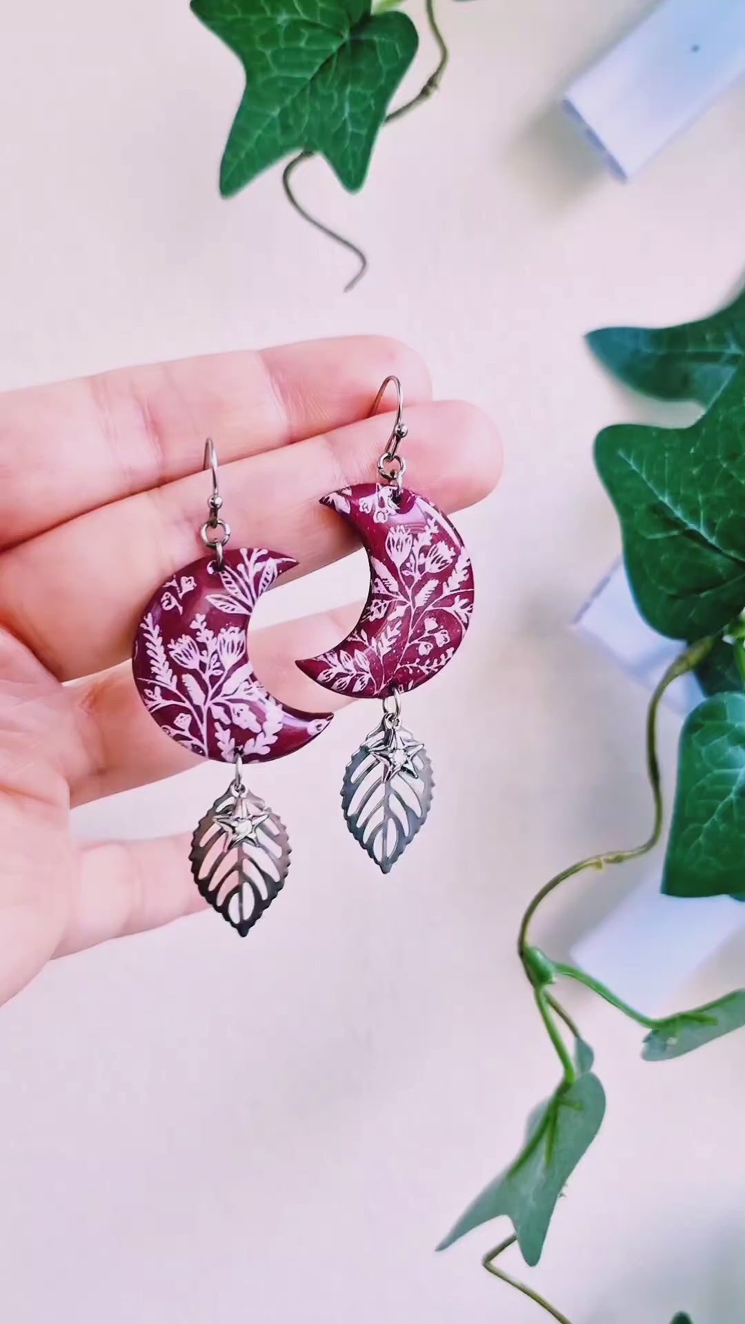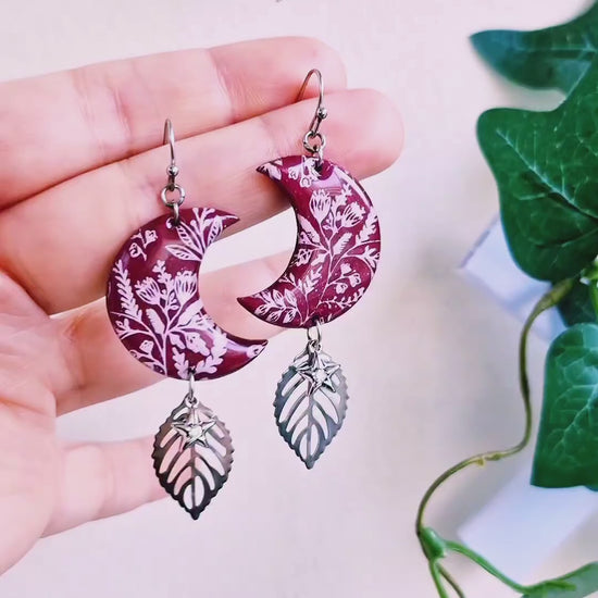 Magiska månar i burgundy av polymerlera och resin med ett ljusrosa blommönster samt ett subtilt glitter som träder fram i olika vinklar. Stjärnor med kristallstenar i samt löv i rostfritt stål. Örkrokar och bindringar av rostfritt stål, nickelsäkra. Finns endast 1 unikt par!