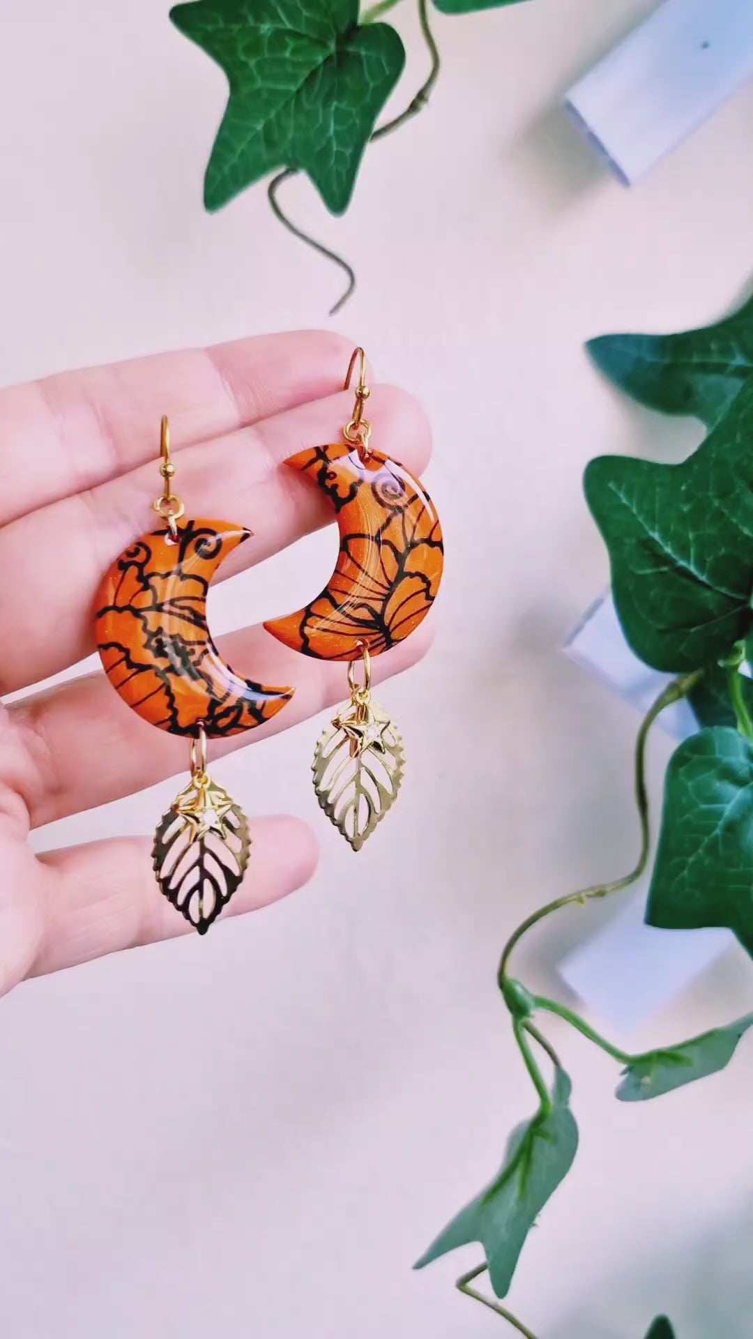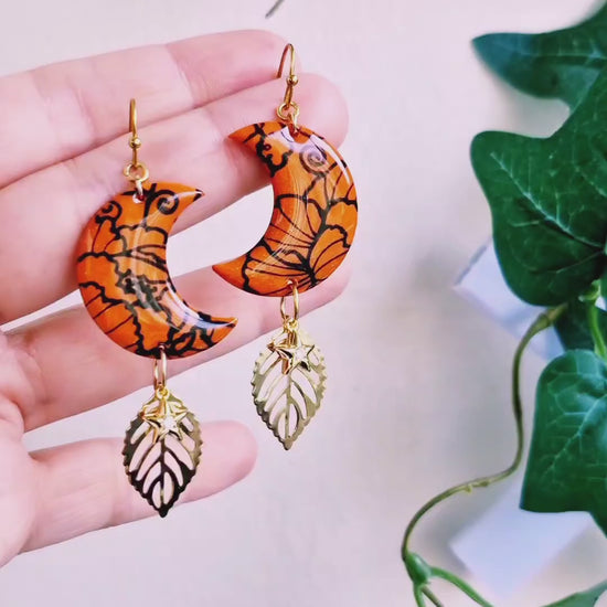 Pumpaorangea magiska månar av polymerlera och resin med ett svart blommönster samt ett subtilt gulditgt glitter. Stjärnor med kristallstenar i samt löv i guldpläterat rostfritt stål. Örkrokar och bindringar av guldpläterat rostfritt stål, nickelsäkra. Finns endast 1 unikt par!