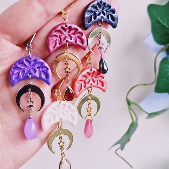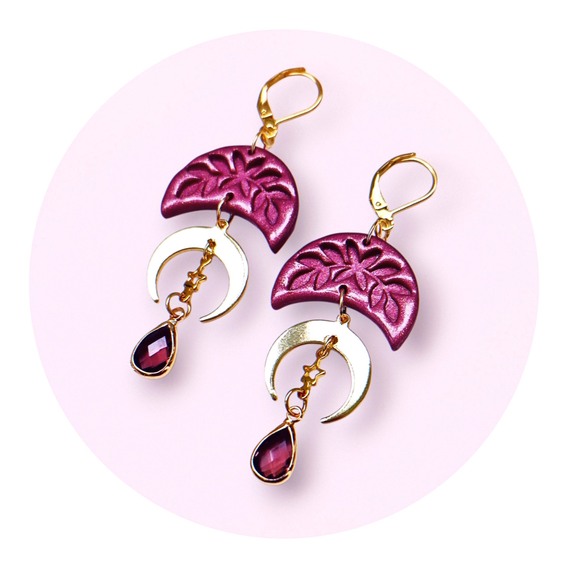Burgundy månörhängen av polymerlera med löv ingraverade samt ett vackert skimmer i leran. Månar med 24k guldplätering, stjärnor av guldpläterat rostfritt stål samt burgundy glaskristaller längst ner i form av droppar. Brisyrer (låskrokar) och bindringar av guldpläterat rostfritt stål, nickelsäkra.