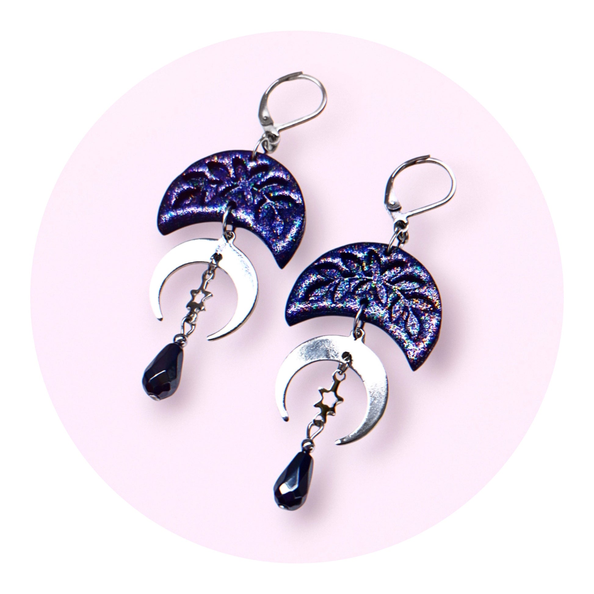 Svarta månörhängen av polymerlera med löv ingraverade samt ett vackert svart regnbågsglitter ovanpå. Antikfärgade nickelfria månar, stjärnor av rostfritt stål samt hematitdroppar längst ner. Små runda pärlor av silverfärgad hematit. Brisyrer (låskrokar), hattpinnar och bindringar av rostfritt stål, nickelsäkra.