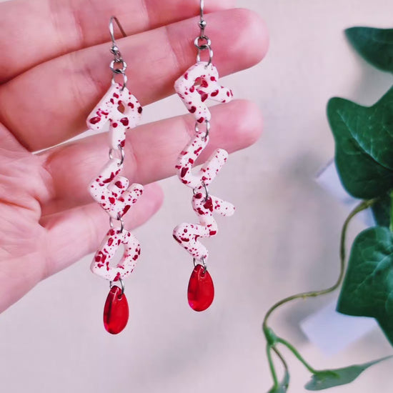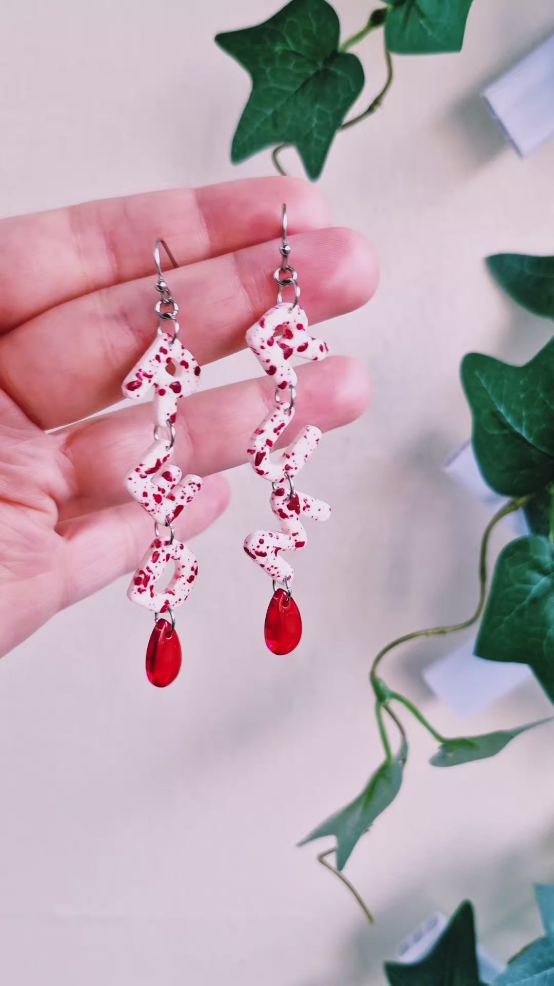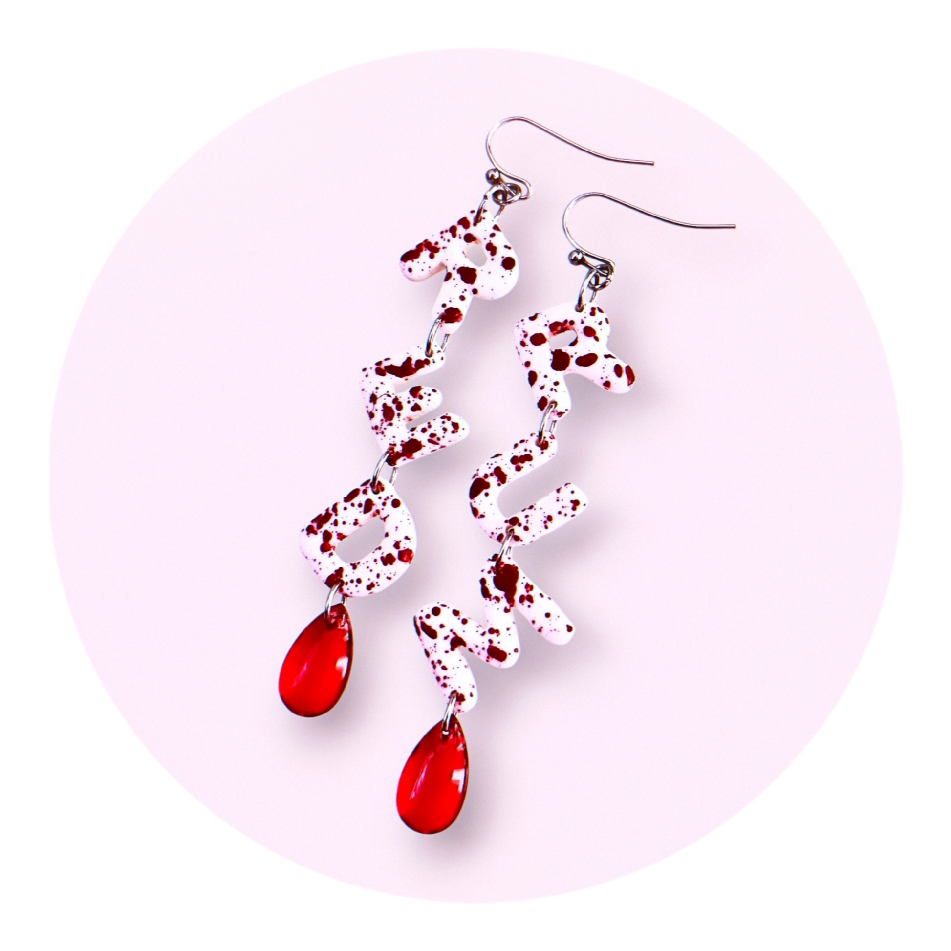 Örhängen med texten REDRUM (murder baklänges) från kultklassikern The Shining. Gjorda av polymerlera och resin med handmålat blodfärgat splatter samt röda glasdroppar som föreställer bloddroppar. Örkrokar och bindringar av rostfritt stål, nickelsäkra.