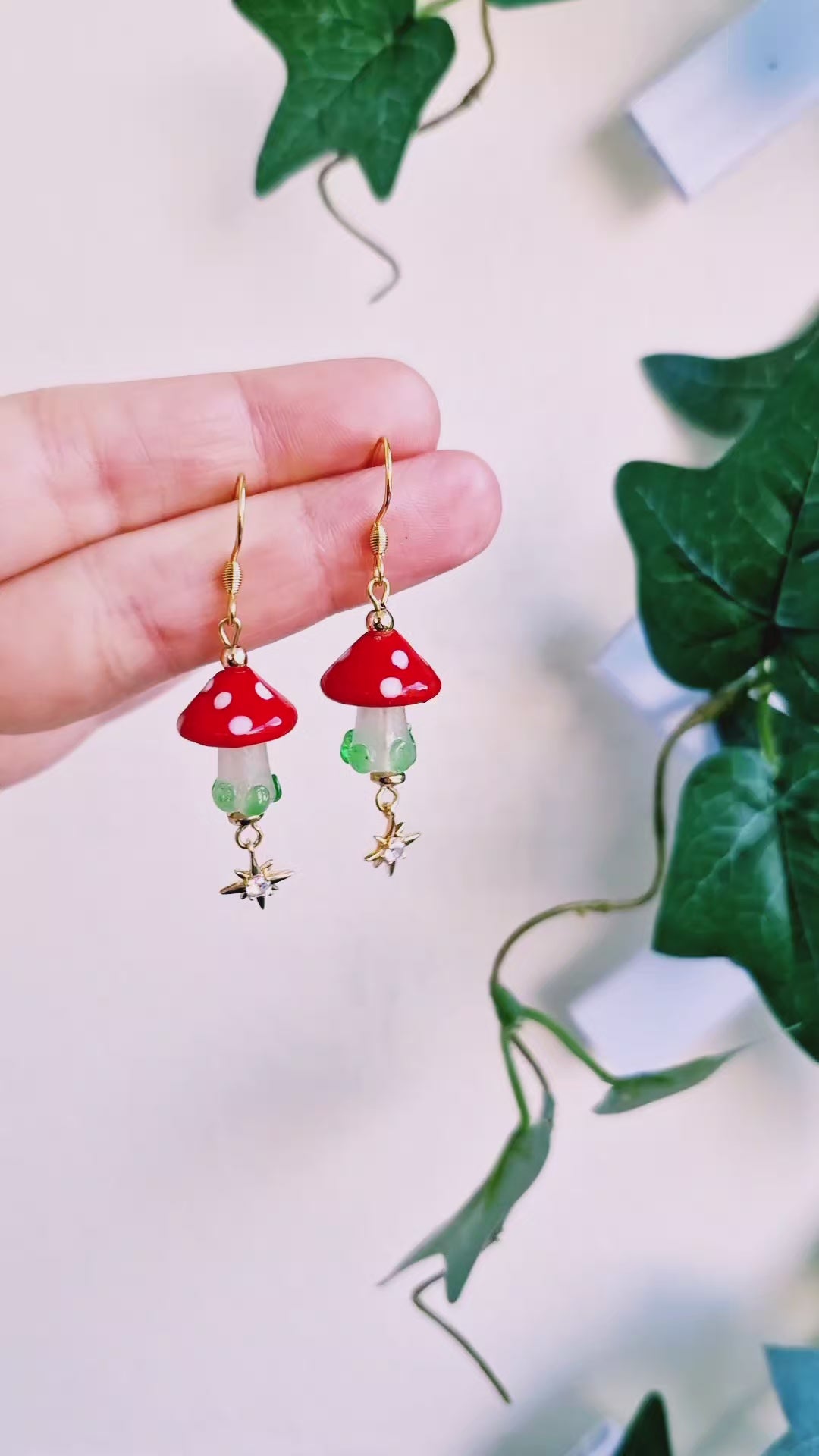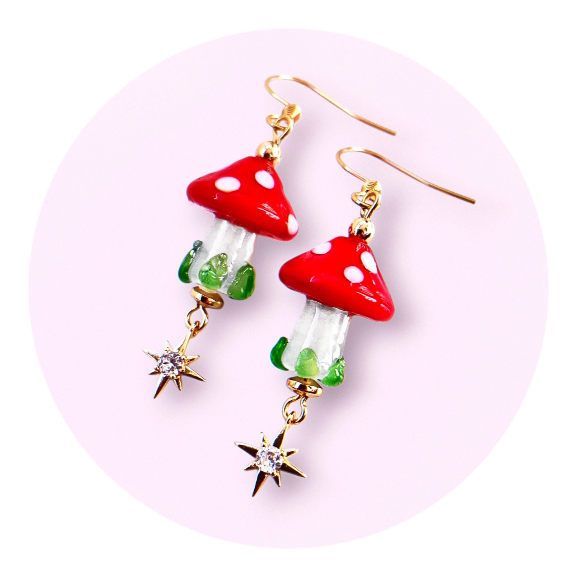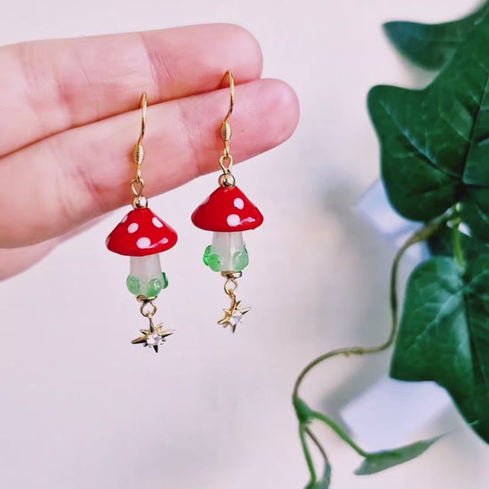 Röda flugsvampar av glas med guldiga dinglande stjärnor med små kristallstenar undertill. Pärlor av guldfärgad hematit. Örkrokar och öglepinnar av guldpläterat rostfritt stål, nickelsäkra.