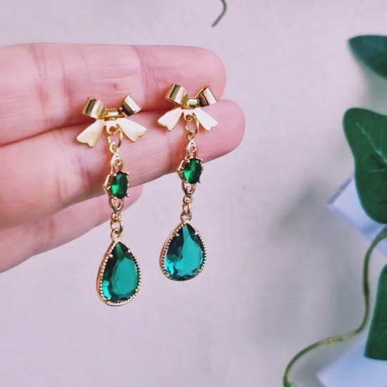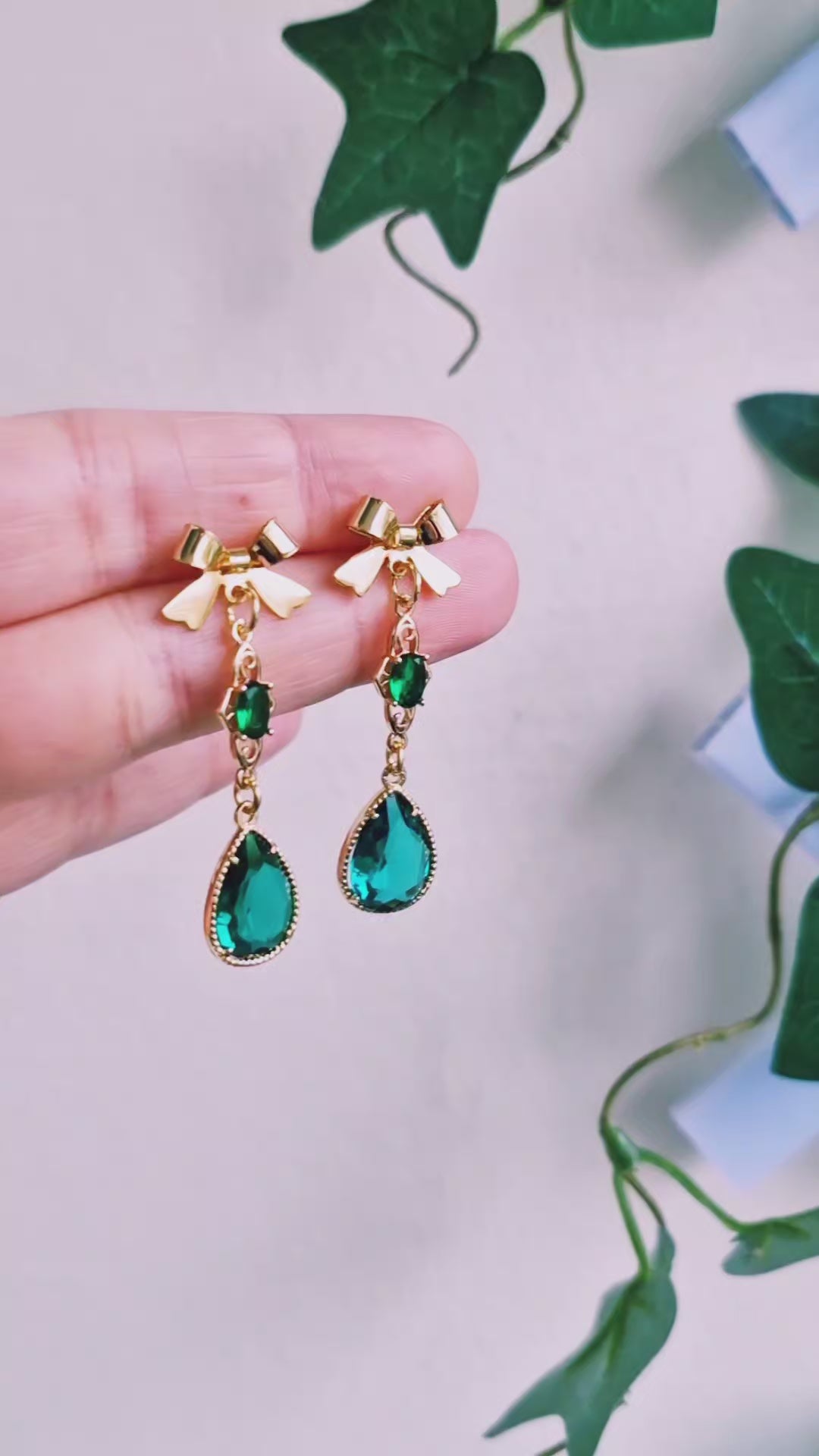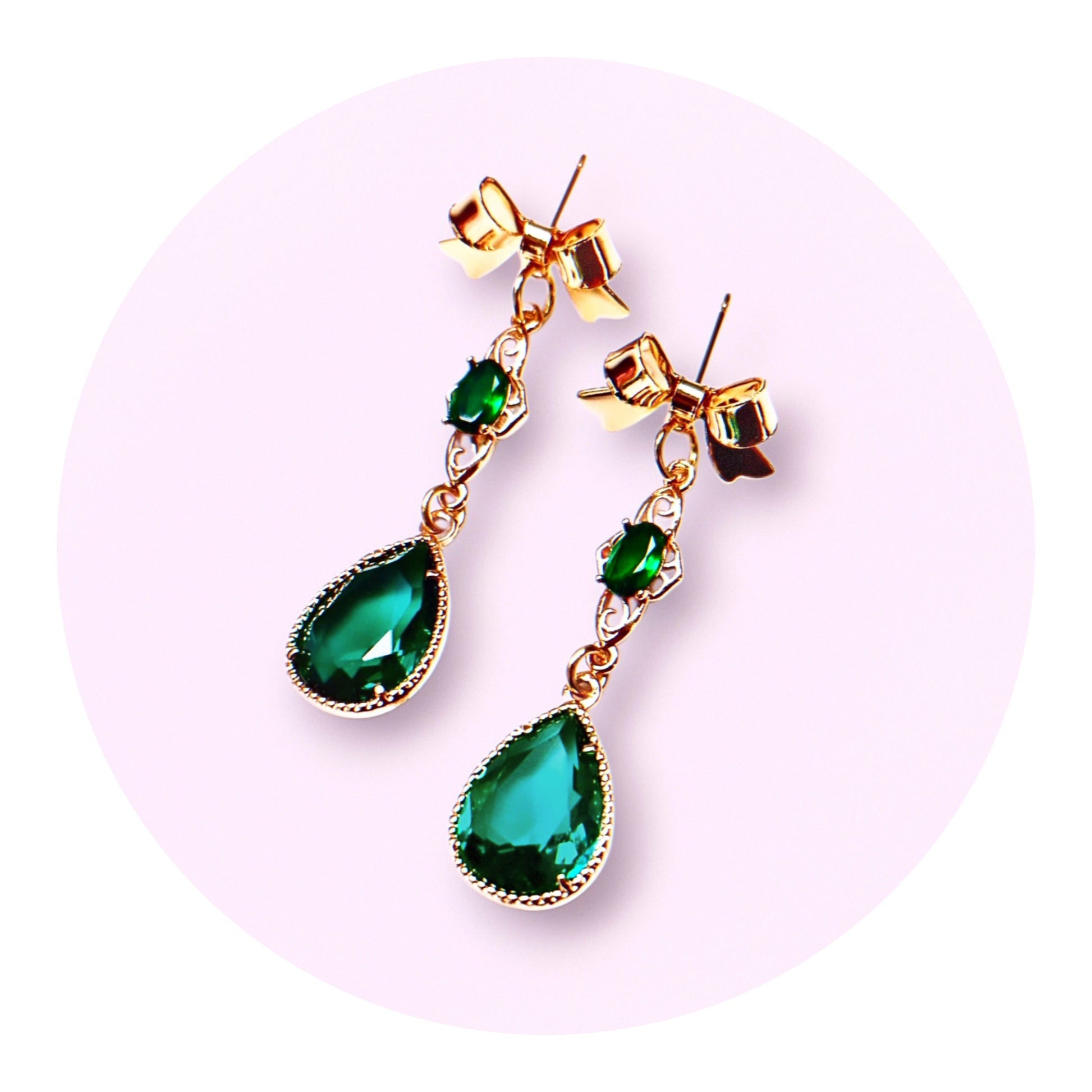 Vackra örhängen med rosetter och gröna glaskristaller. Rosettstift av guldplätterad mässing, nickelsäkra.