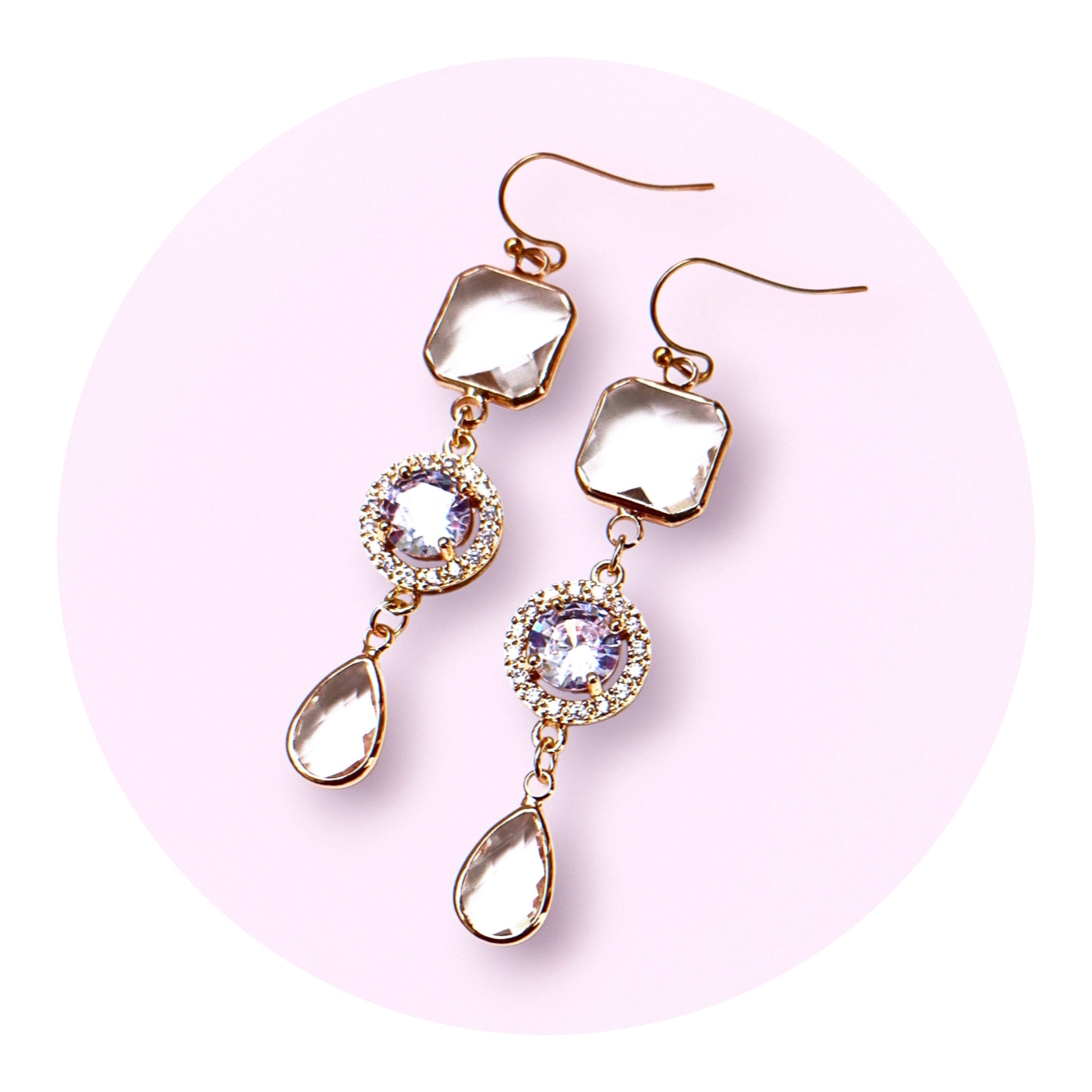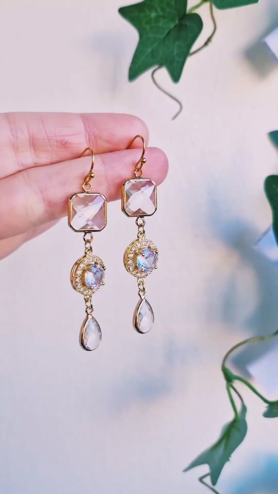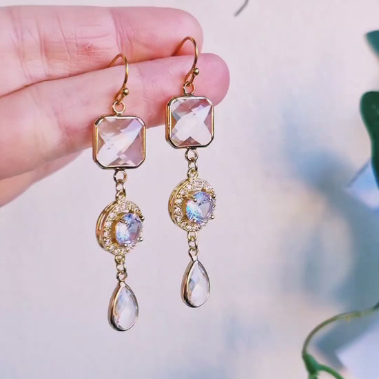 Vackra örhängen i guld med glaskristaller samt små Cubic zirconia kristaller. Pergekta till fest! Örkrokar och bindringar av guldpläterat rostfritt stål, nickelsäkra. Det finns endast 1 unikt par!