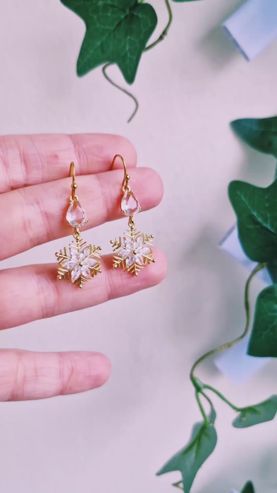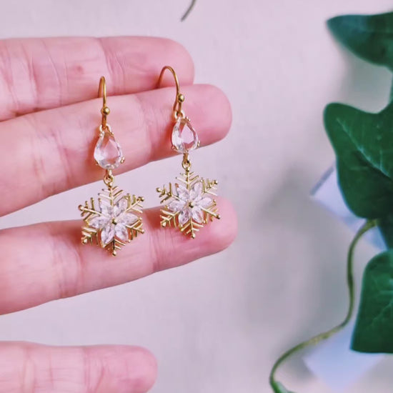 Gnistrande guldiga snöflingor med Cubic zirconia kristaller samt droppformade glaskristaller ovanför. Örkrokar av guldpläterat rostfritt stål, nickelsäkra.