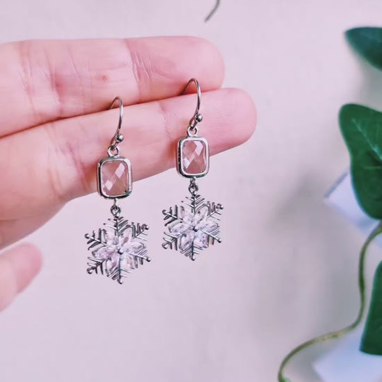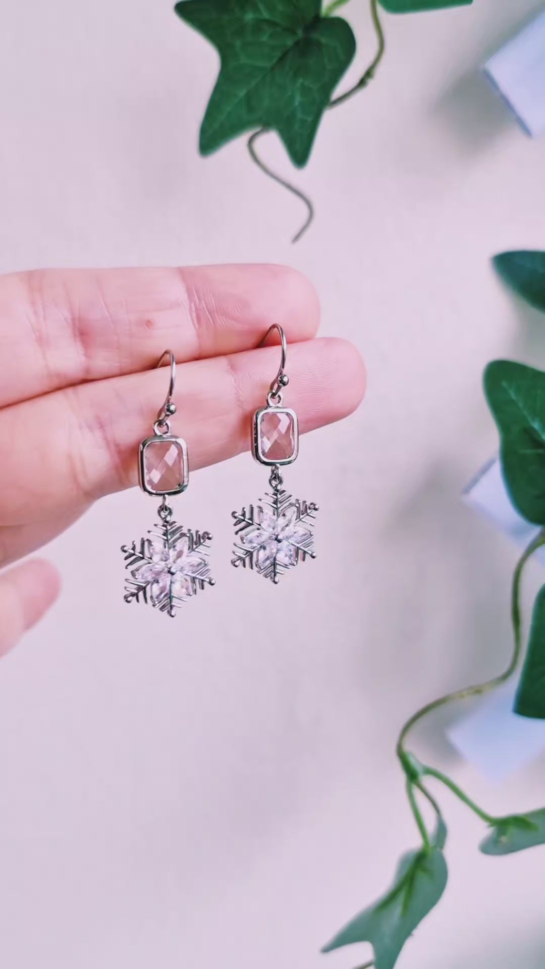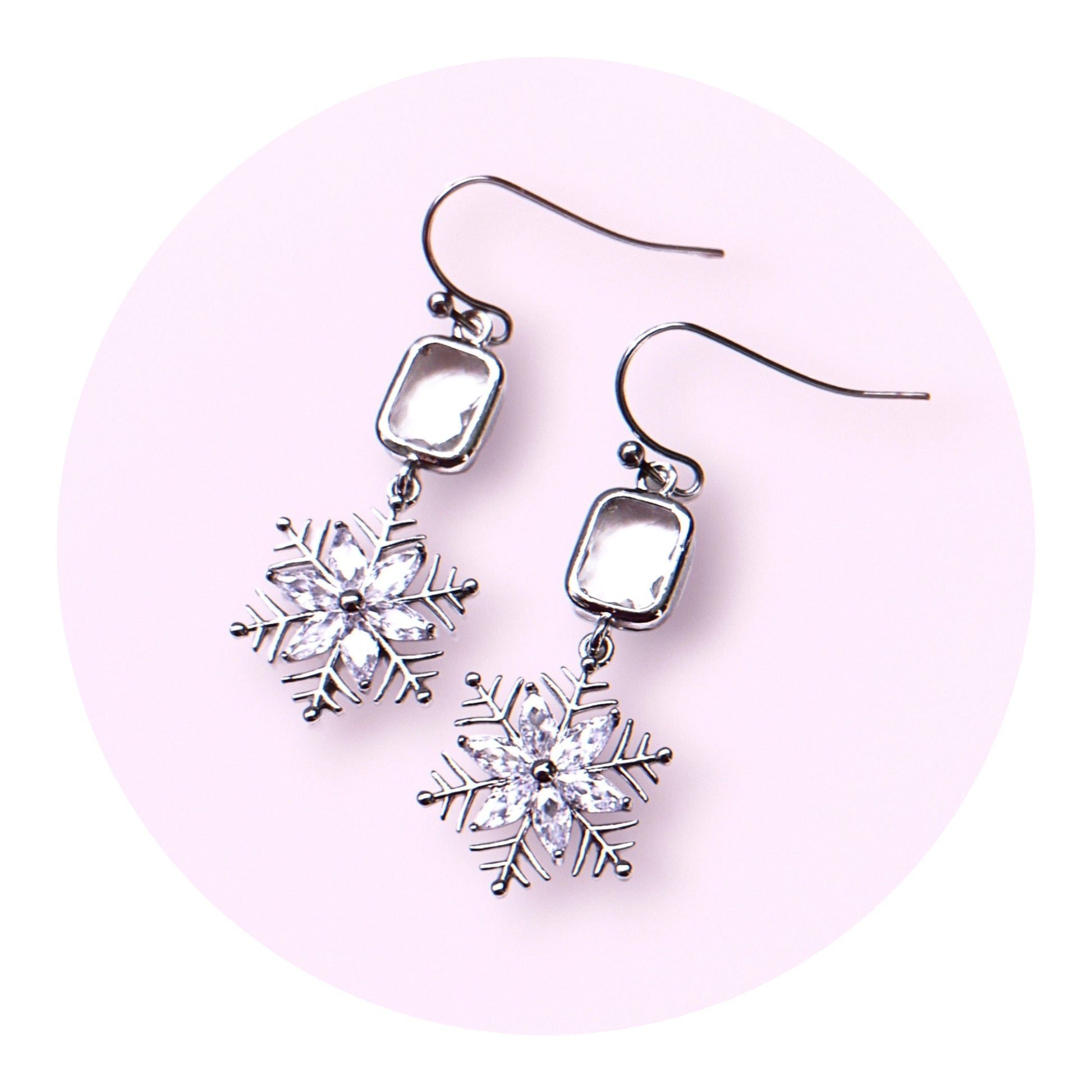 Gnistrande silvriga snöflingor med Cubic zirconia kristaller samt glaskristaller ovanför. Örkrokar av rostfritt stål, nickelsäkra.