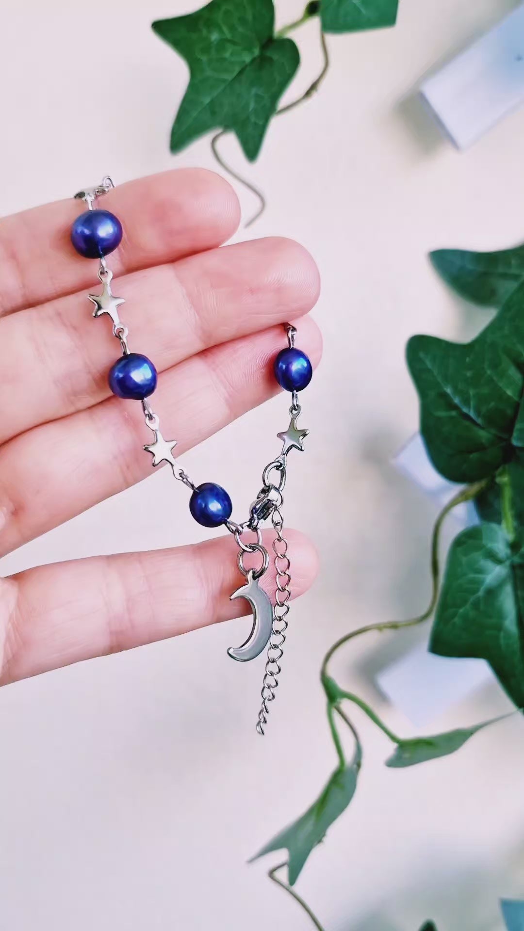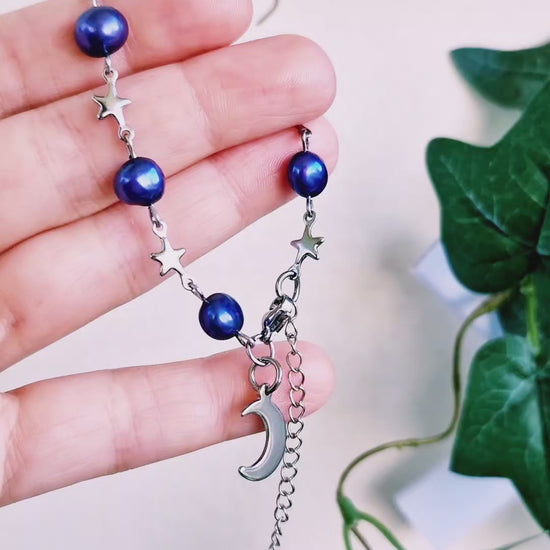 Silvrigt stjärn- & månarband med äkta sötvattenpärlor i en blå färg med lila hint. Samtliga metalldelar är av rostfritt stål, nickelsäkra.
