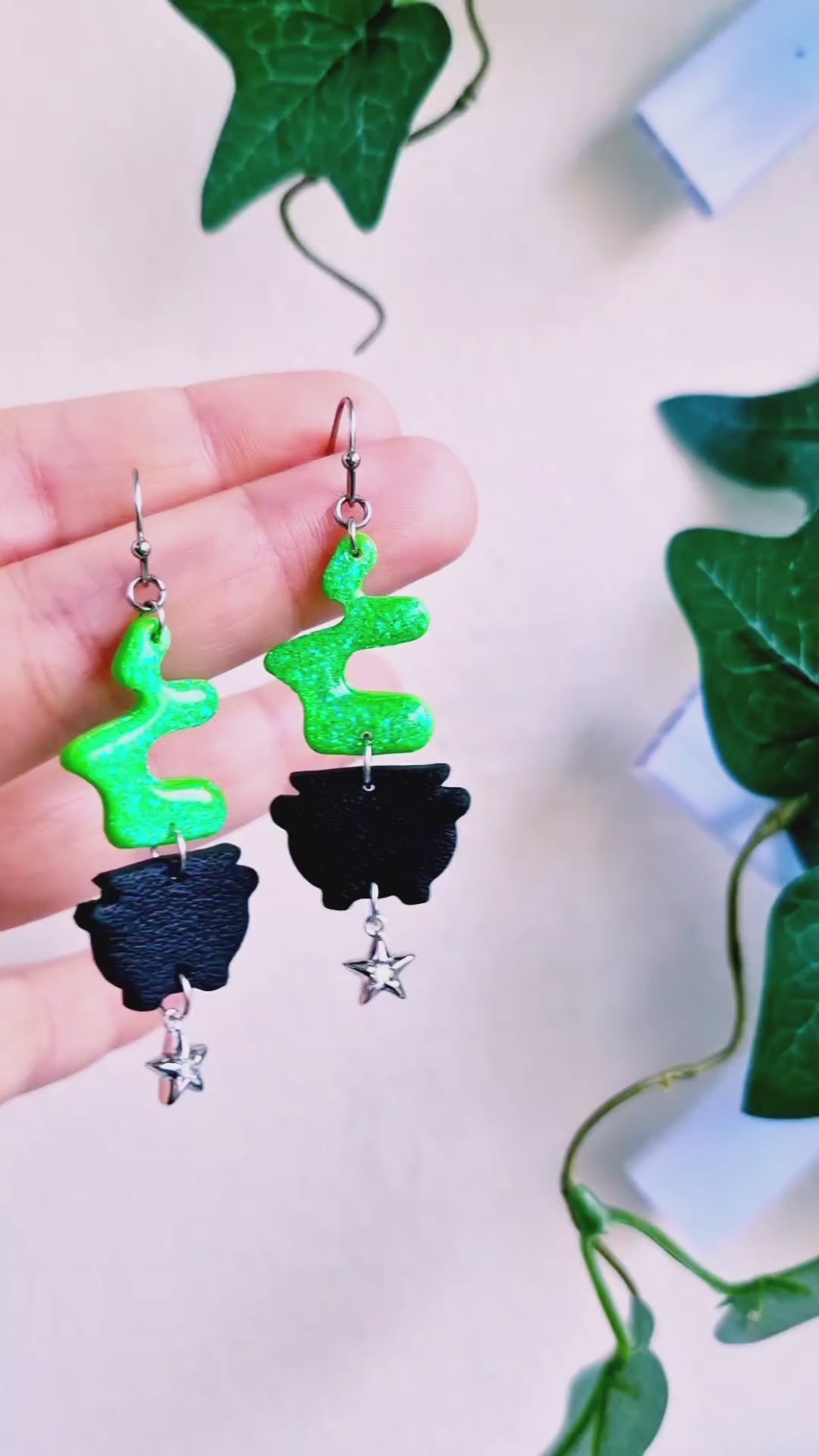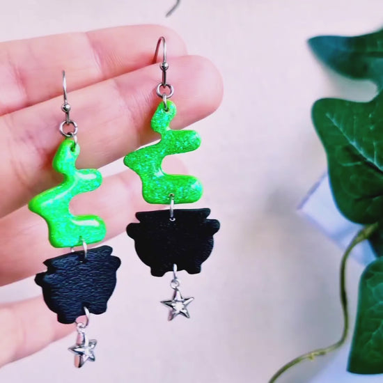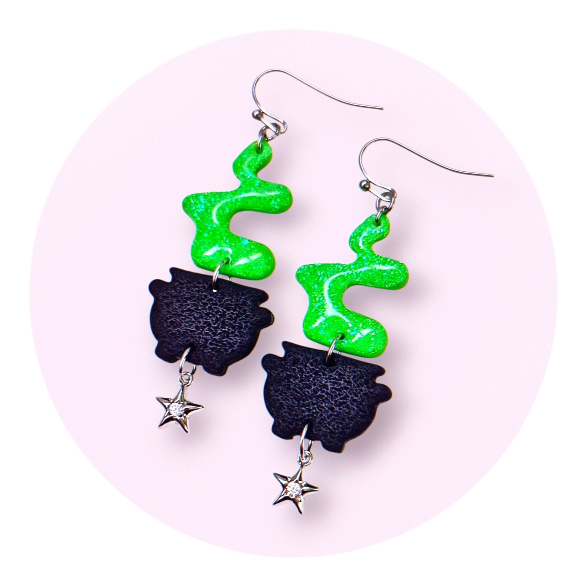 Svarta kittlar med grön trolldryck gjorda av polymerlera och resin. Trolldrycken glittrar magiskt fint. Dinglande silvriga stjärnor undertill med små kristallstenar. Örkrokar och bindringar av rostfritt stål, nickelsäkra.