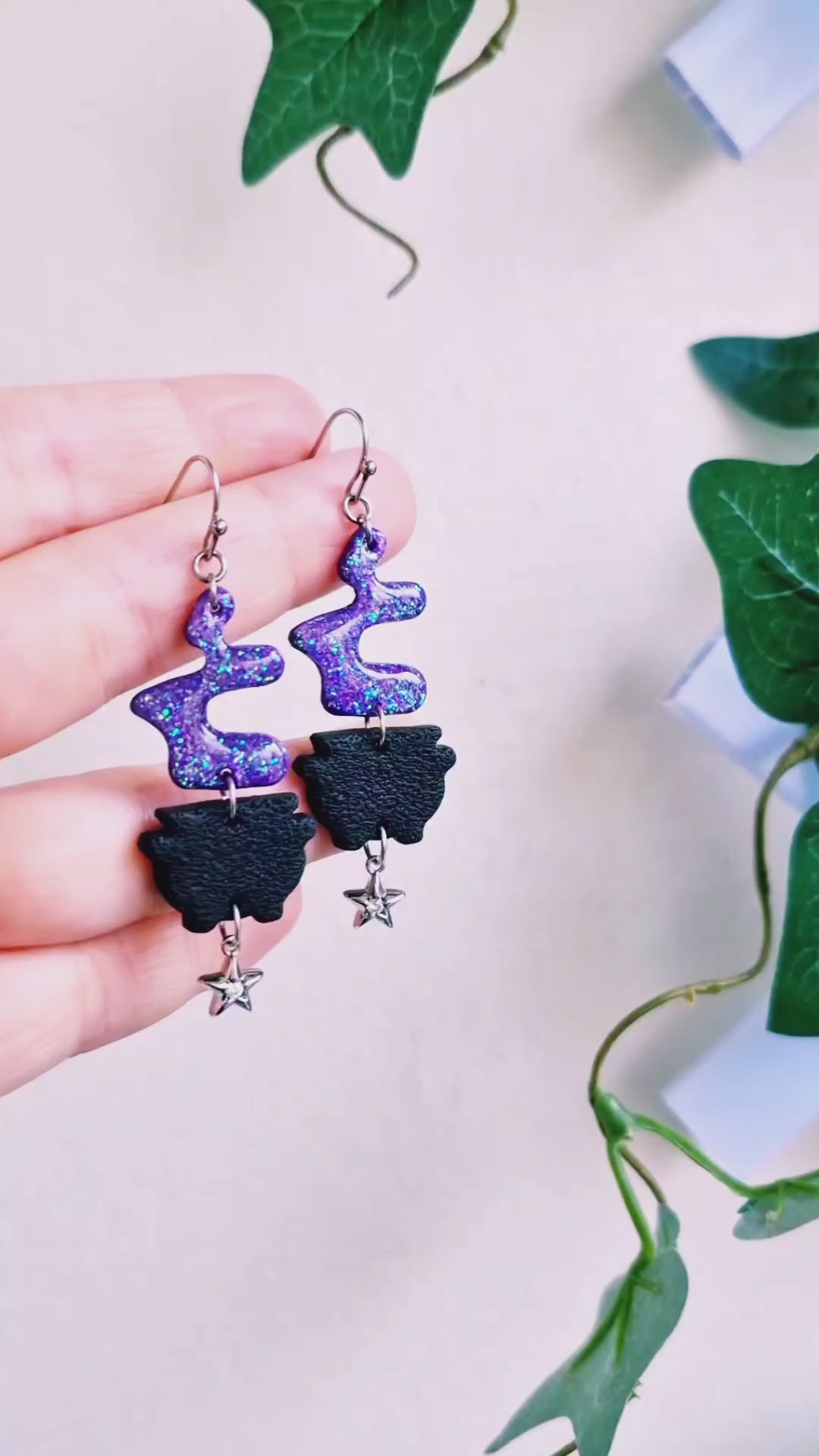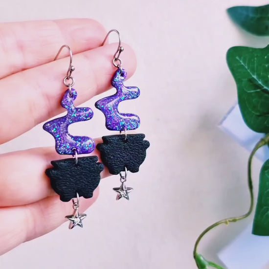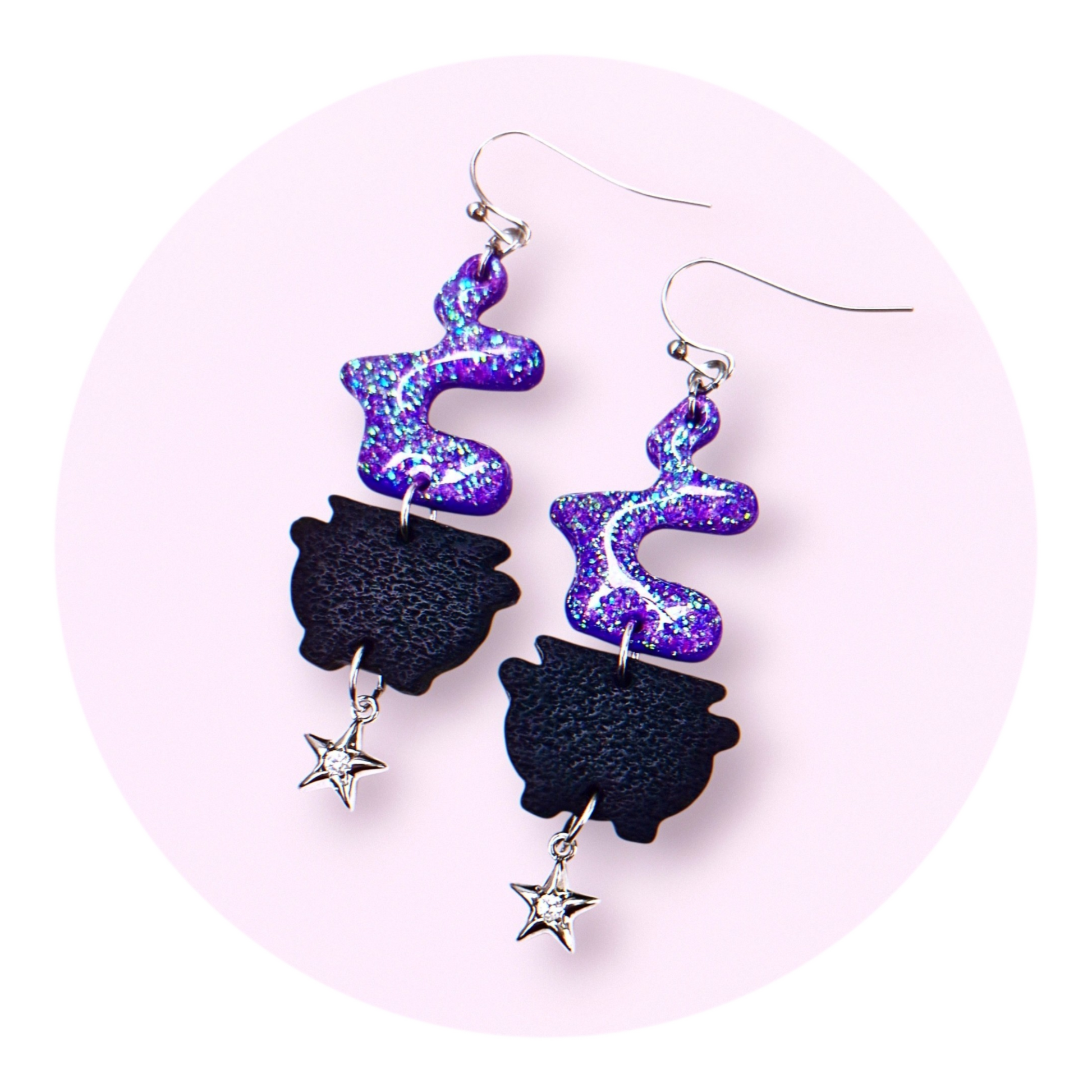 Svarta kittlar med lila trolldryck gjorda av polymerlera och resin. Trolldrycken glittrar magiskt i lila, turkost och grönt. Dinglande silvriga stjärnor undertill med små kristallstenar. Örkrokar och bindringar av rostfritt stål, nickelsäkra.