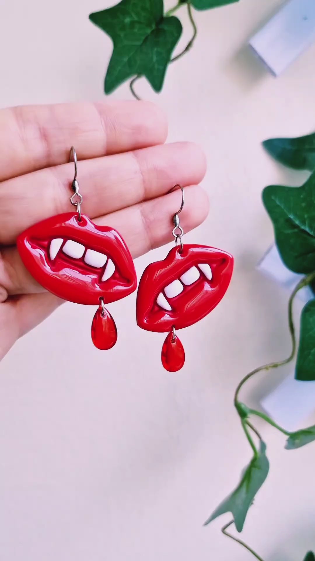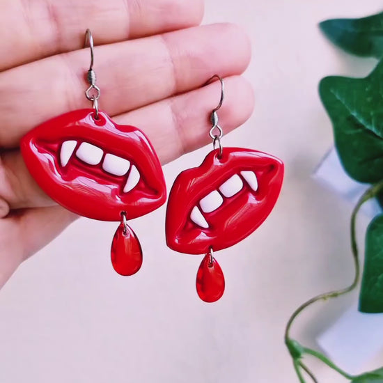 Glossiga läppar med vampyrtänder av polymerlera och resin med röda glasdroppar som föreställer bloddroppar. Örkrokar och bindringar av rostfritt stål, nickelsäkra.